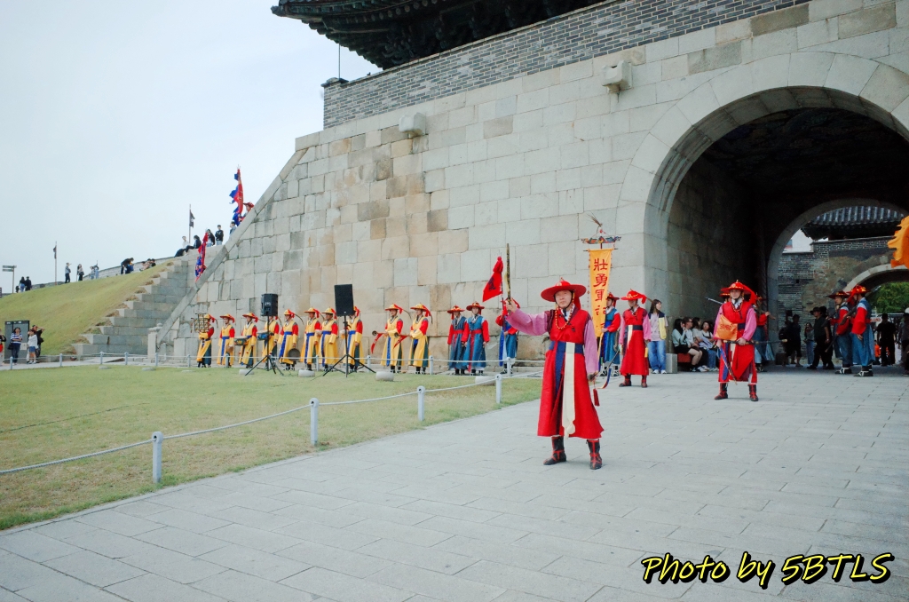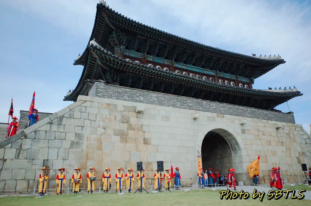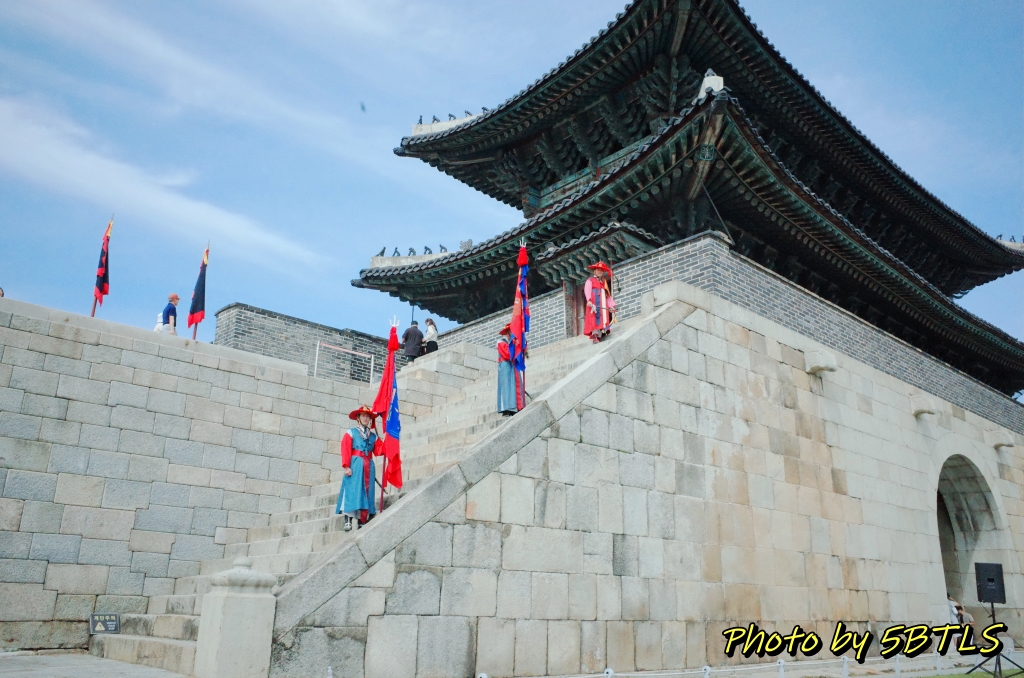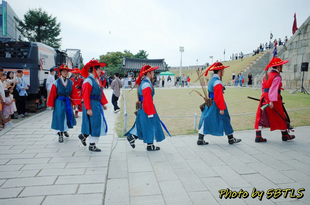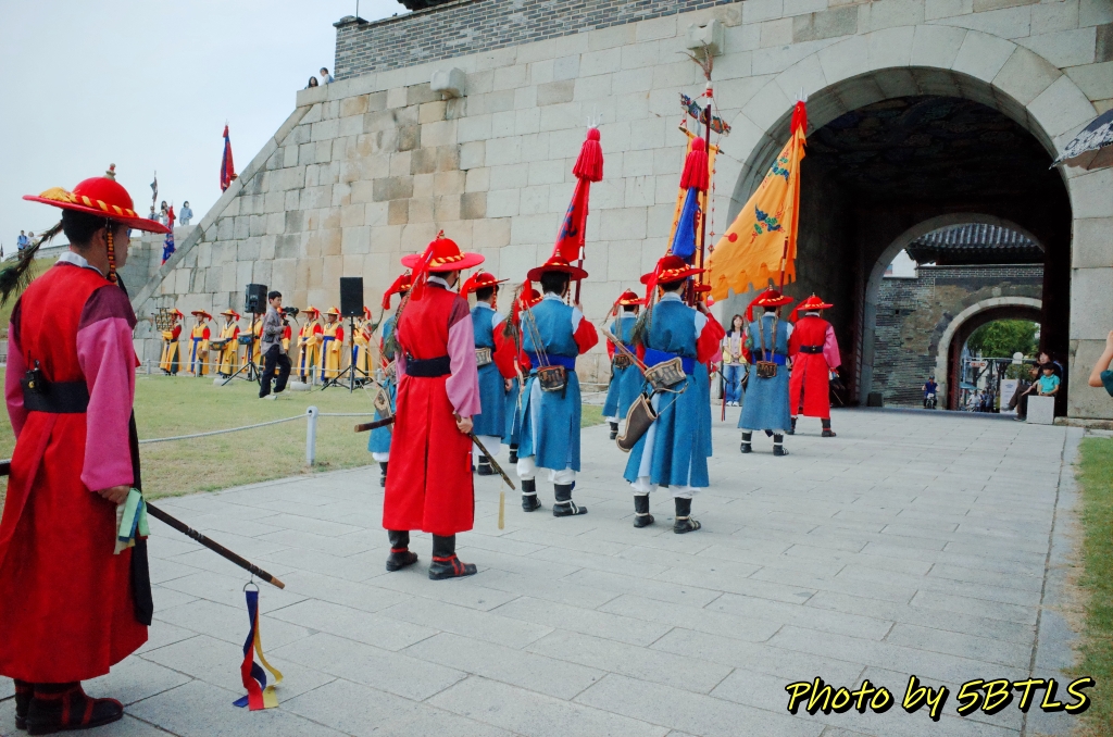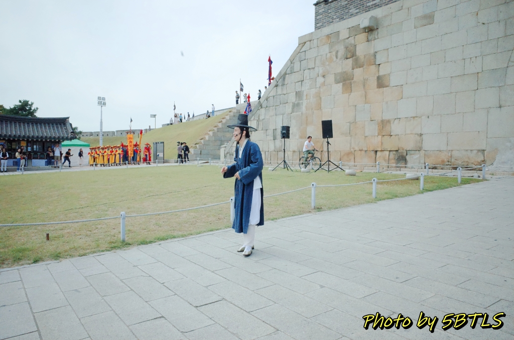 힐링폴링의 시작이자 거의 전반부를 맡게 되는 '세계유산축전'이 9월 23일에 시작되었습니다. 점심을 팔달문시장에 자주 가는 분식집에 가서 먹고는 천천히 걸어서 2시에 진행되는 장용영 관련 공연 행사를 보러 장안문으로 이동했습니다. 원래 이 행사는 축전 기간 동안 토요일 1시와 2시에 화서문에서 진행되는 행사인데, 9월 23일의 경우에는 화서문에 개막공연이 저녁에 예정되어 있어 리허설 등이 진행되서 이 날만 장안문에서 진행되었는데요. 가 보니 벌써 일부 출연진...아니 군인들이 장안문의 좌우, 장안문으로 올라가는 계단에 정렬해 있더군요.