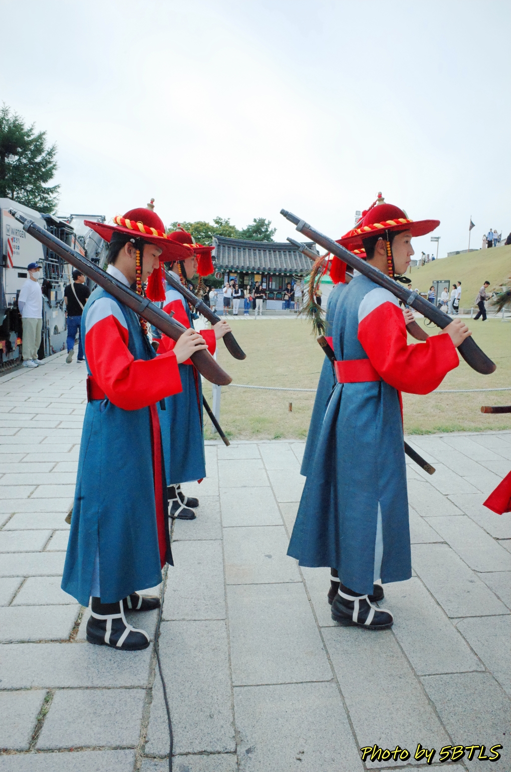 행사는 장안문 남쪽(화성행궁 쪽)에 있는 약간의 잔디밭과 통로에서 진행되었는데요, 아래 사진에서 보이듯이 장안문에서 화서문쪽에 있는 안내소 뒤쪽에 서 있던 장용영 군사들이 출발해서는, 잔디밭 앞으로 돌아와서는 장안문 바로 앞에서, 이전 근무를 서던 근무조와 교대를 하고 나오는 수위의식(이거 광화문이랑 대한문에서도 할 겁니다.)을 진행했습니다. 행사의 시작은 현자총통으로 포를 쏘는 소리를 내면서 시작했습니다.