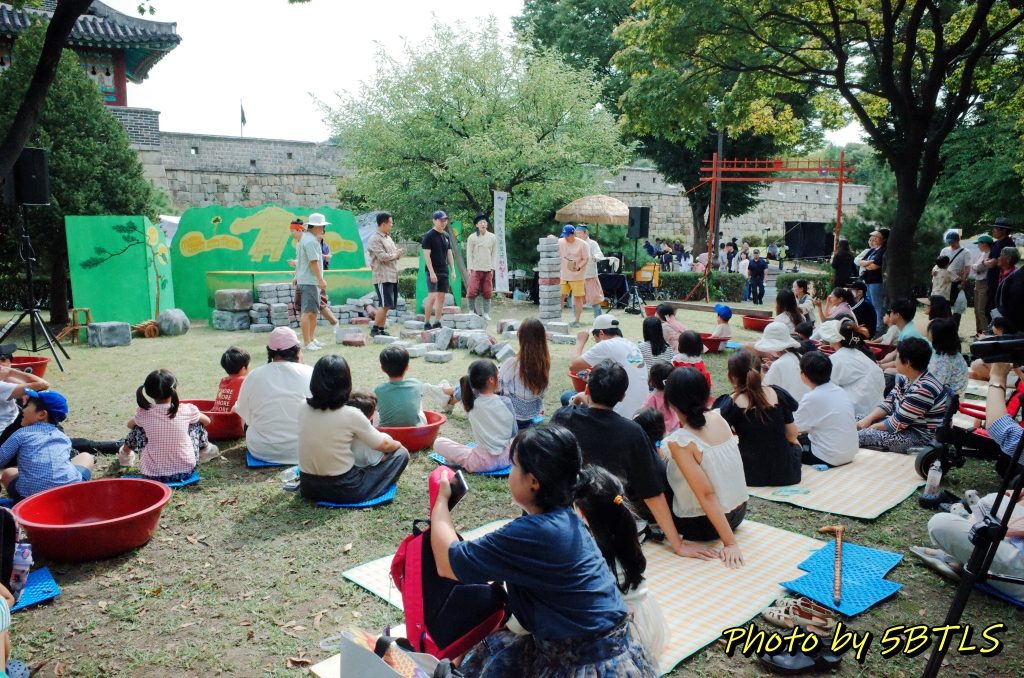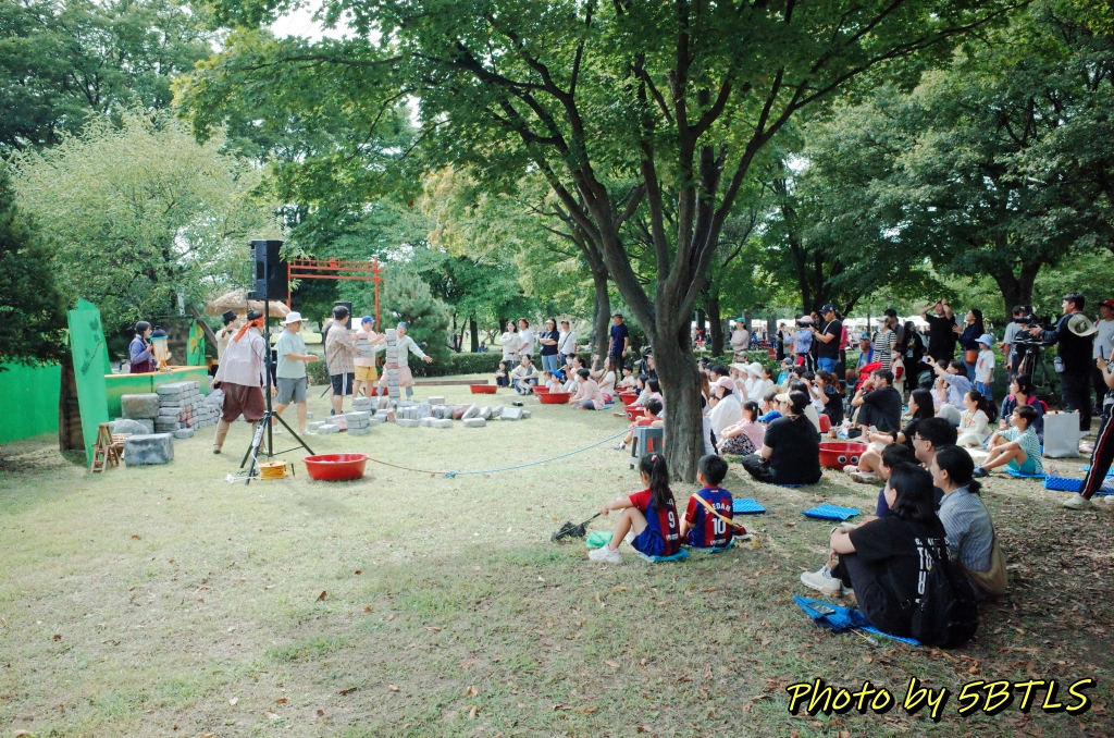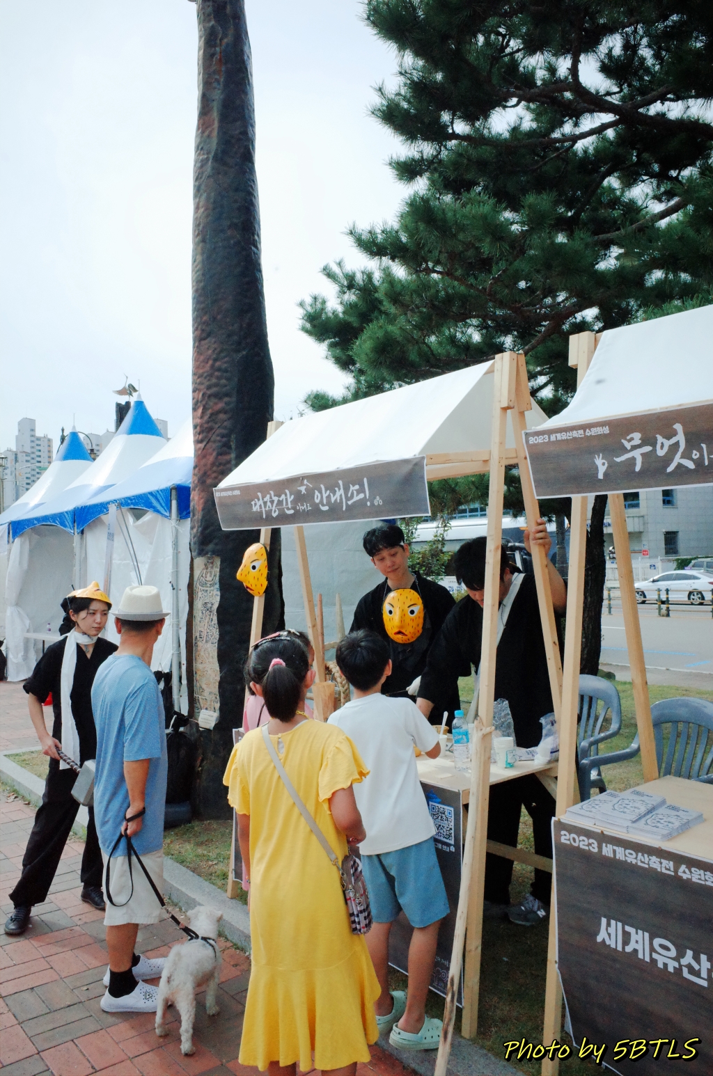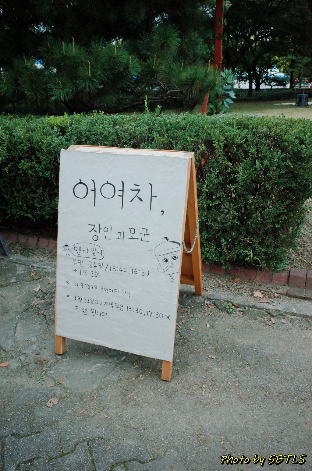 그리고, 장안공원 내 행사하는 곳곳을 다니다 보면 초랭이를 쓰고 있는 분들과 부스가 보이고, 거기에는 이런 저런 전통 놀이로 아이들과 재밌게 즐기고 있는 분들이 있었는데요.. 이 분들이 아마 3년째 하고 있는 인형극 '어여차, 장인과 모군'의 출연진인데, 공연이 없을 때는 이렇게 아이들과 놀아주면서 미리 호객(?) 행위를 하는게 아닌가 싶기도 했습니다.