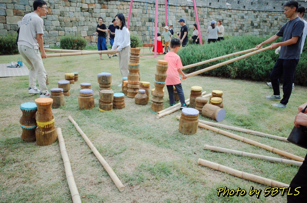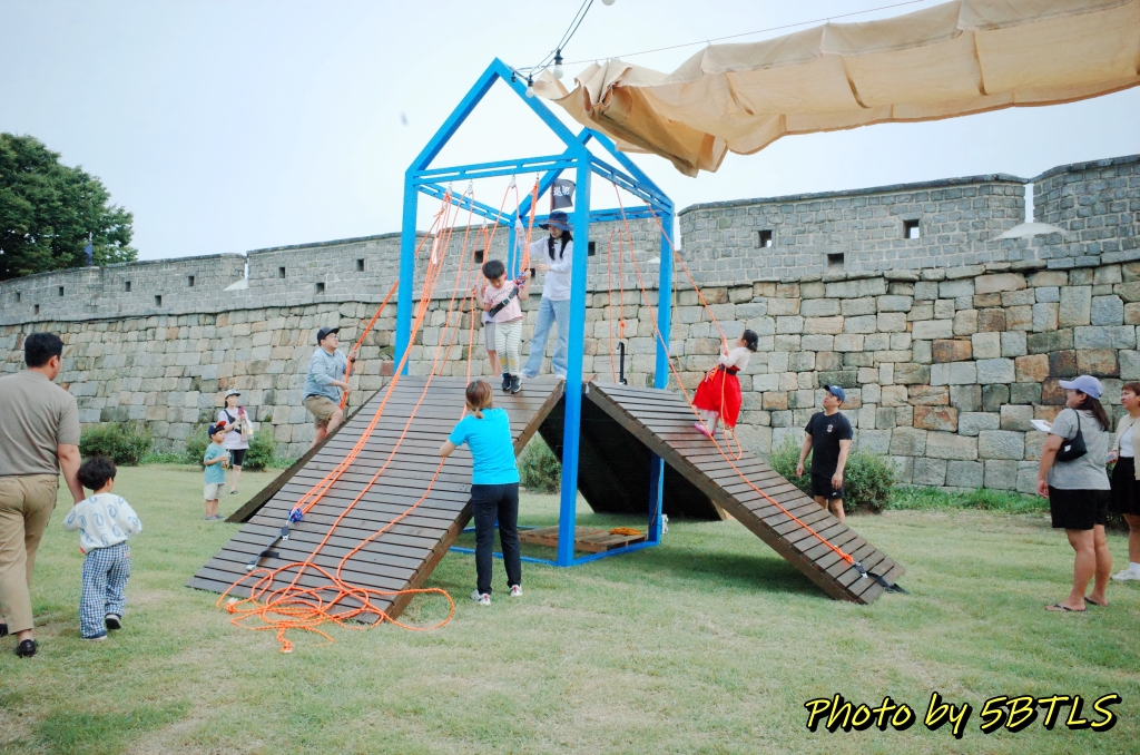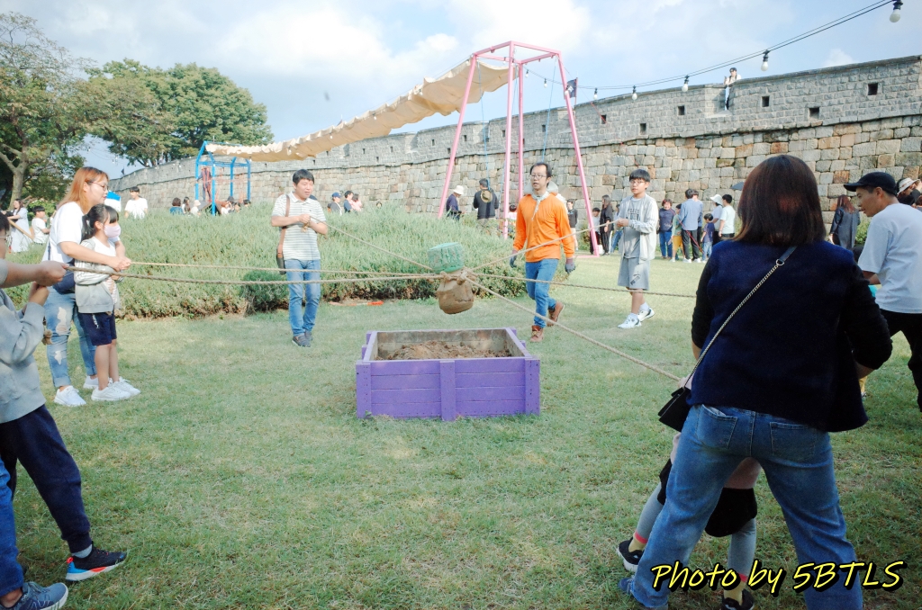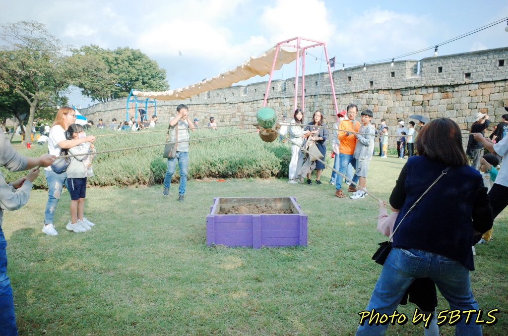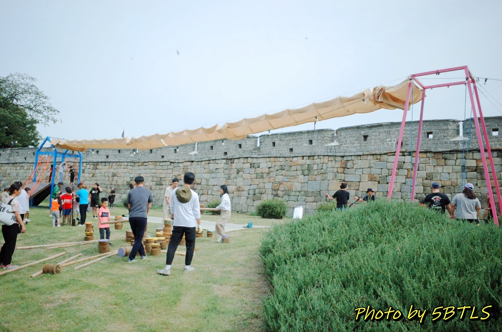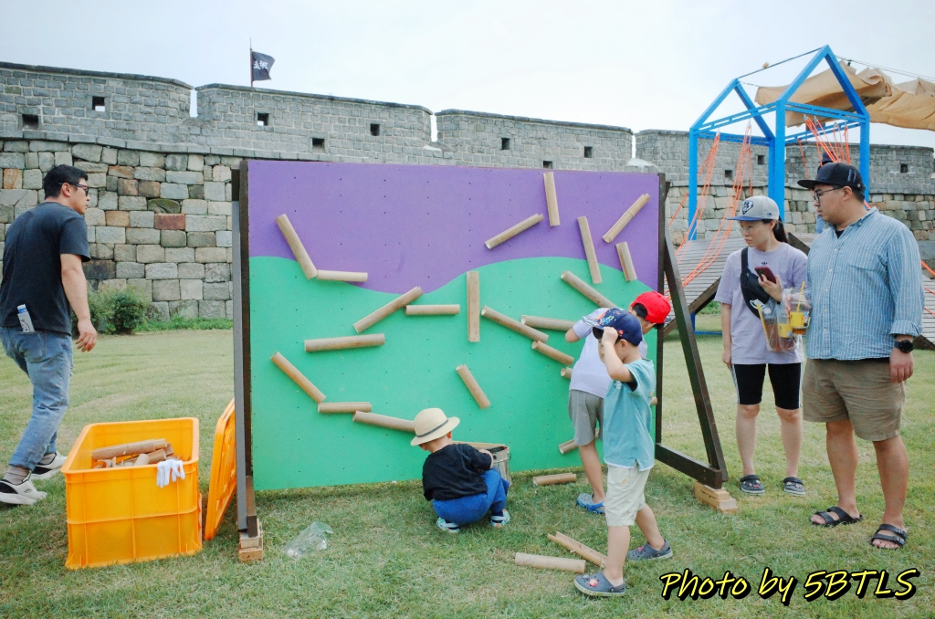 이 축성놀이터는 작년에는 화성행궁광장과 SK미술관 사이의 큰 잔디밭에서 진행이 되었었는데, 올해는 장안공원의 성곽 바로 앞 잔디마당에 설치가 되었습니다. 근데 작년에 있던 6개 중에서는 '달구질'하고 '막대로 짐 나르기'만 그대로가 나머지는 새로이 생긴 게 좀 있더군요.
