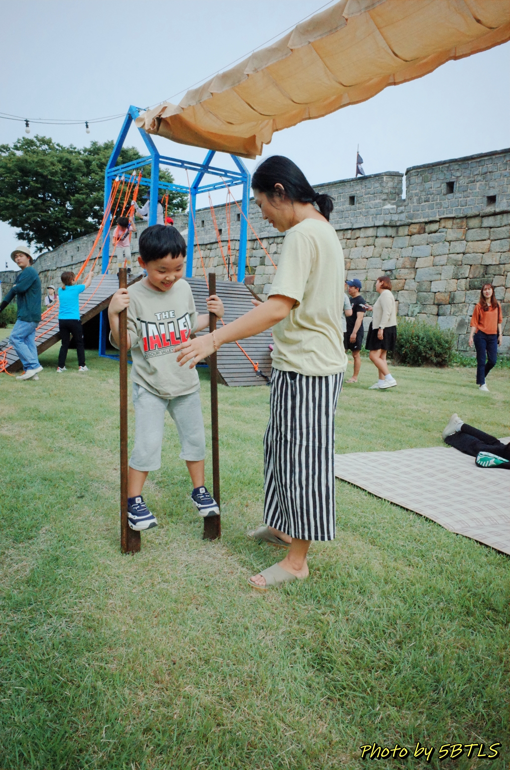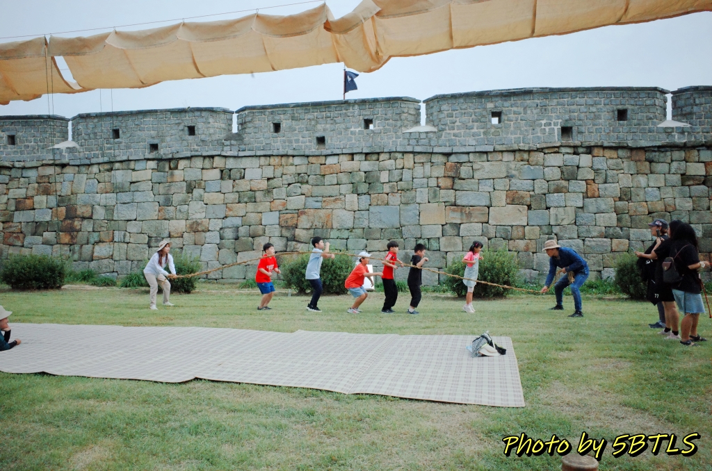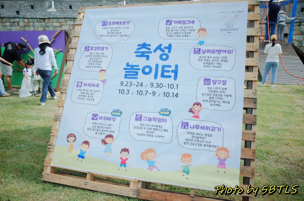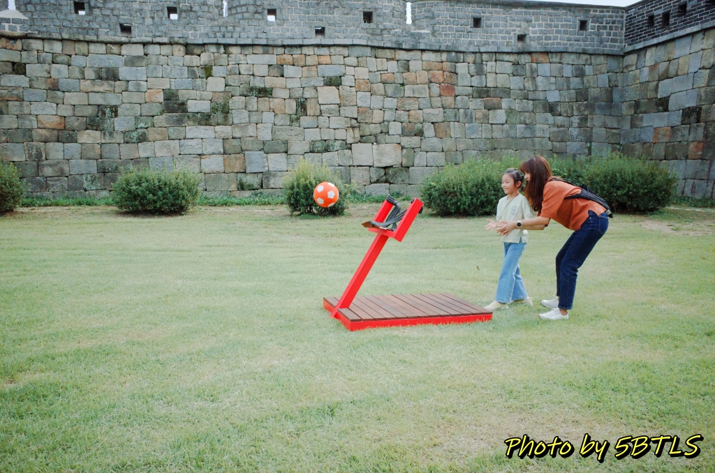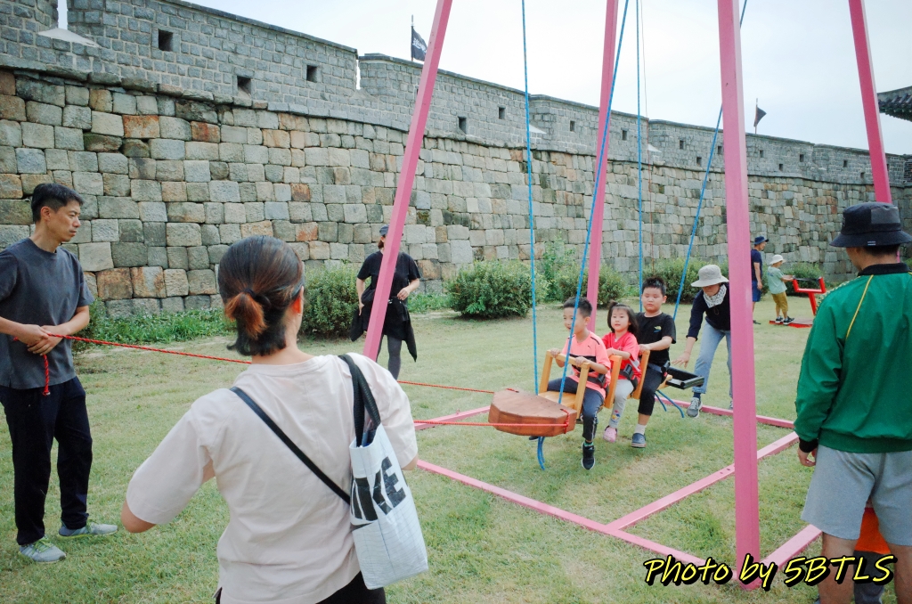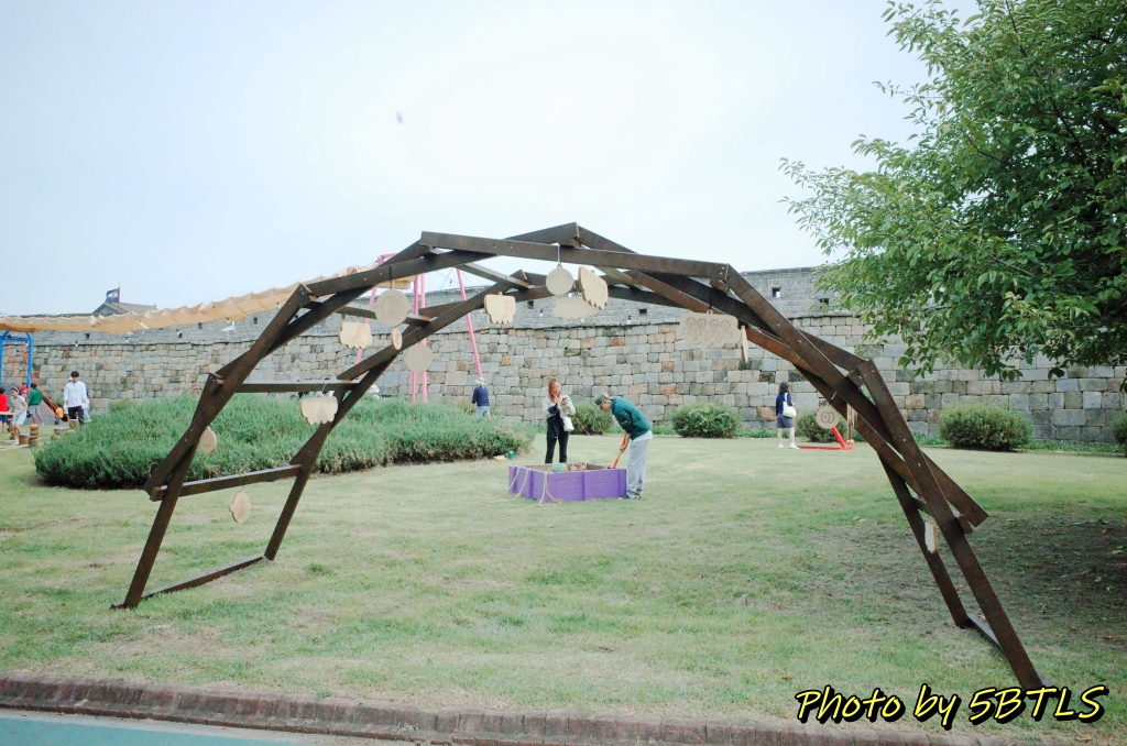 이 축성놀이터는 작년에는 화성행궁광장과 SK미술관 사이의 큰 잔디밭에서 진행이 되었었는데, 올해는 장안공원의 성곽 바로 앞 잔디마당에 설치가 되었습니다. 근데 작년에 있던 6개 중에서는 '달구질'하고 '막대로 짐 나르기'만 그대로가 나머지는 새로이 생긴 게 좀 있더군요.