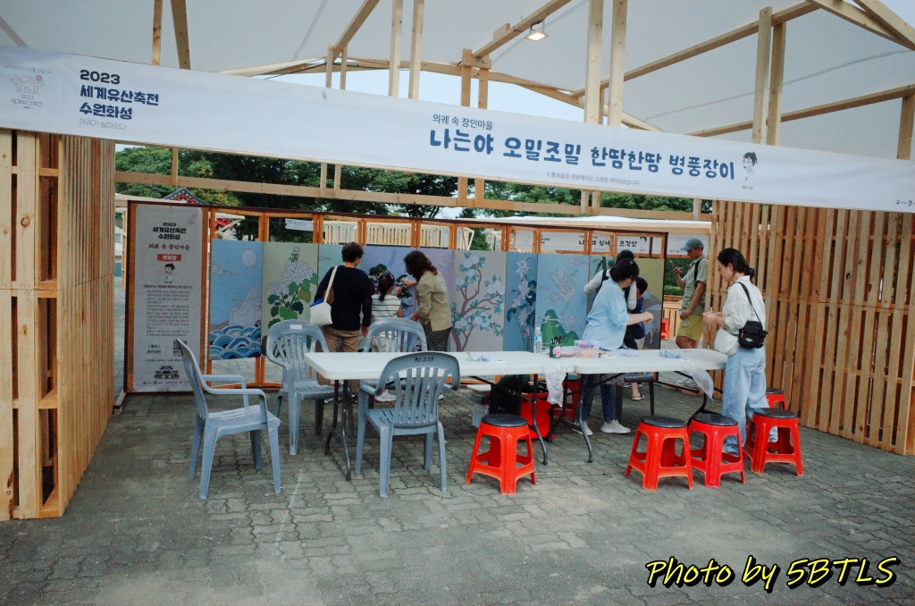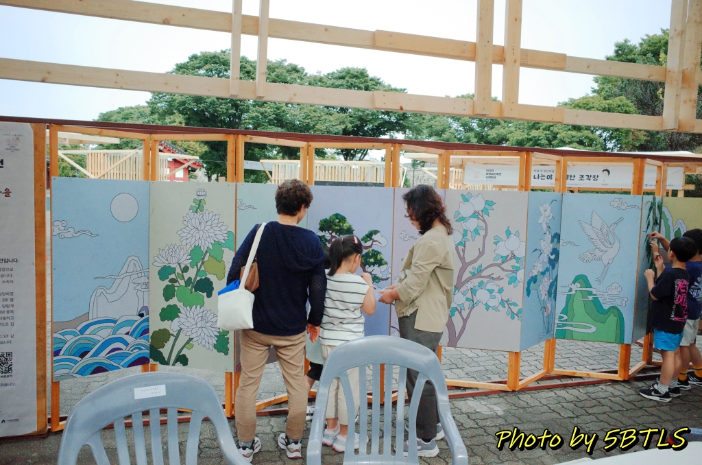안내 부스를 지나가면 가장 먼저 만나는 건 병풍장이었는데, 부스 안쪽에 설치된 10폭의 병풍에는 이미 밑그림이 있었고, 체험하시는 분들은 색종이를 잘라서, 그걸 밑그림에 맞춰 붙이는 작업을 하게 되더군요. 나중에 행사 끝날 때 쯔음에 완성된 걸 보러 오면 나름 이쁠 거 같아서 기대 중입니다.