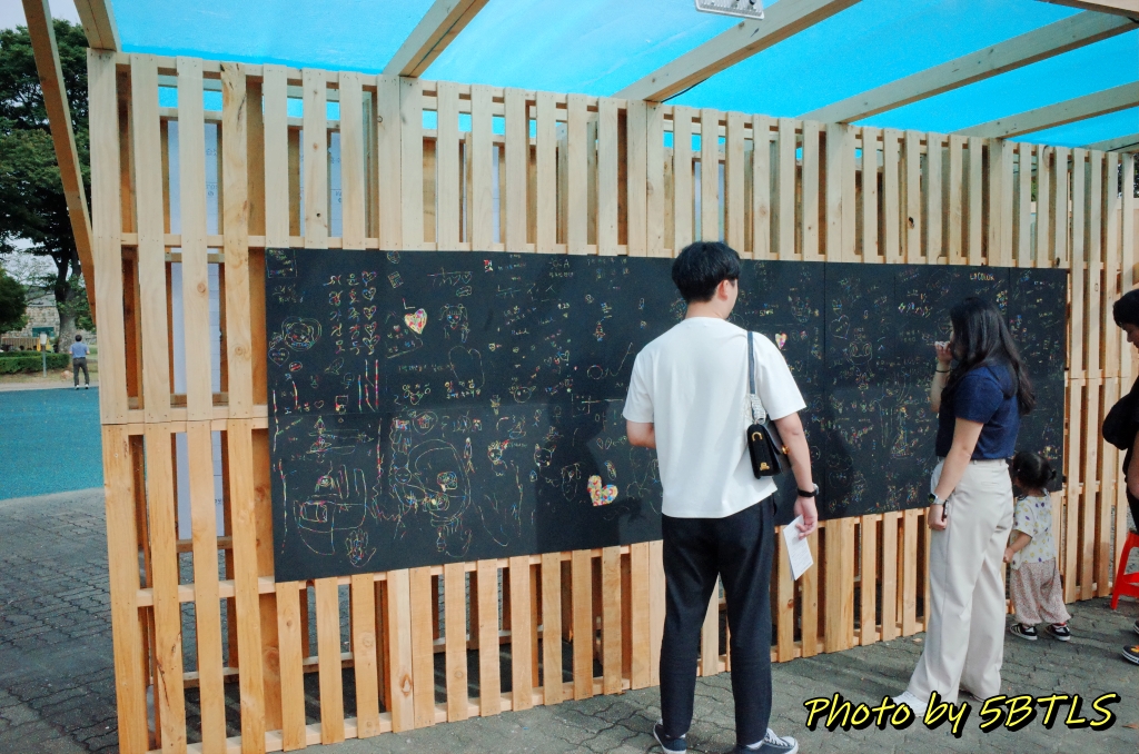 그 옆에는 조각장에서 한 것과 같은 원리인 흑판 게시판이 있었는데, 지나가는 사람들이 마치 맛집 벽에다가 사인이나 글귀 남기듯이 글귀를 남겨서 저희도 하나 남기고 지나가려는데... 바로 옆이 각자장이라면서 각자 하나 쓸 것을 강요(^^) 하셔서 나무 명패 같은 곳에다가 색깔 펜으로 또 족적을 하나 남기고 왔습니다.