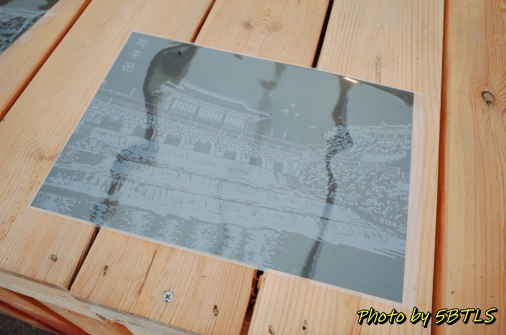 작년에도 있었던 조각장이 그 근처였는데요, 여기는 유료 체험인데, 아래와 같은 긁는 종이에 잘 그려서(음각 하듯이)는 수원화성에 대한 밑그림을 하나 잘 그어주면 작품을 하나 받아 가게 되는 거더군요.