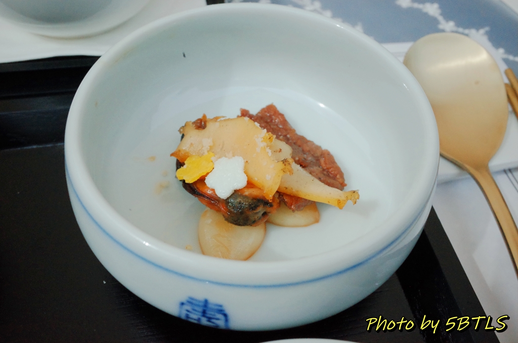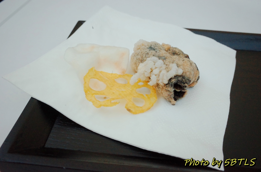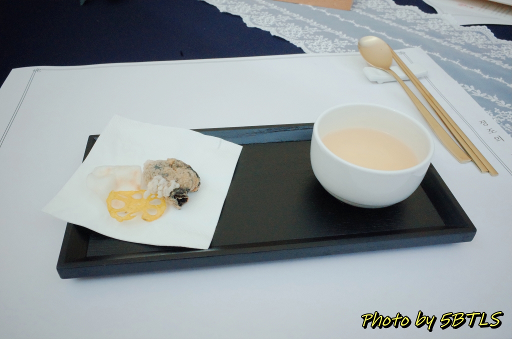 자리에 앉아 있으니, 바로 행사가 시작되어서 먼저 전식(전채요리)에 해당되는 작두콩차와 김부각, 연근칩, 감자칩을 가져다 주셨습니다. 그걸 하나씩 먹기 시작하자 행사를 진행하시는 대령숙수와 노상궁님이 나와서는 이런저런 얘기(정조의 아버지인 사도세자 얘기, 정조의 얘기, 화성을 짓게 된 얘기, 그리고 원행을묘정리의궤의 얘기와 이 음식들이 재현되게 된 사연 등)를 하시고는 바로 '아름드리'라고 하는 퓨전국악을 하시는 밴드 분들의 연주가 시작되었습니다.