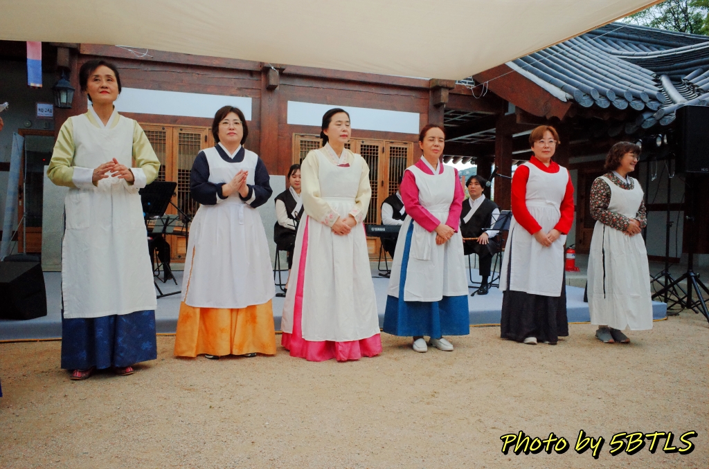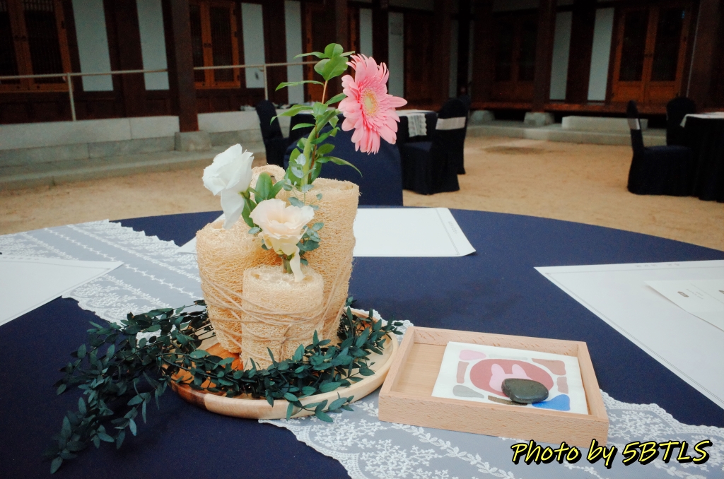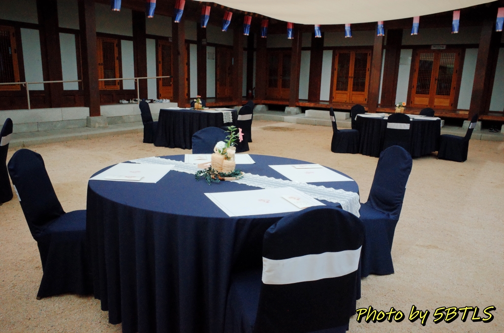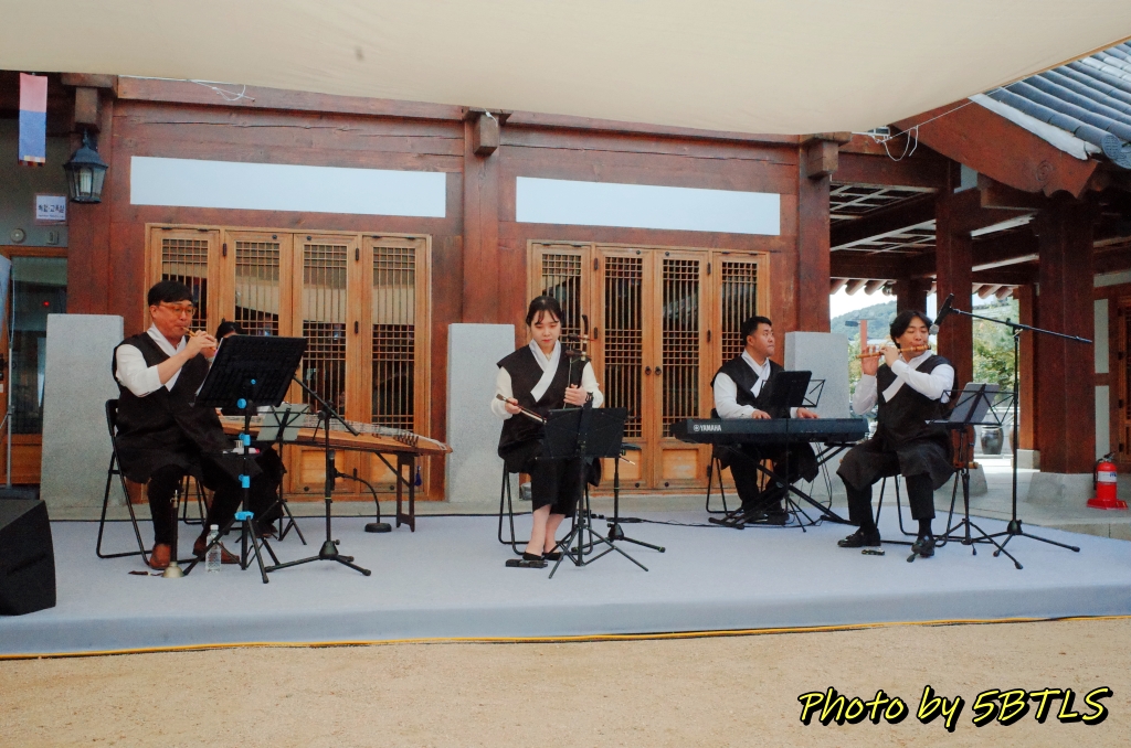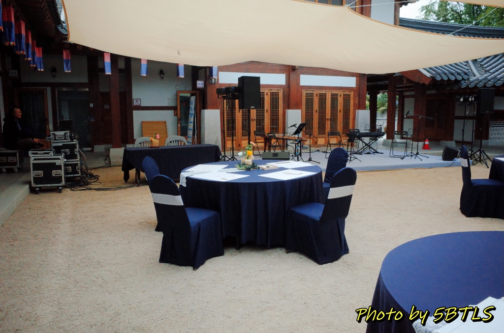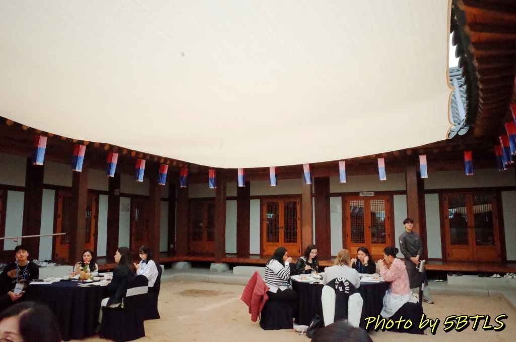 전통문화관 안에 식생활체험관 안뜰에 위치한 행사장에는 4인 또는 5인 테이블이 준비되어 있었고, 비가 오거나 또는 햇빛을 막기 위한 차양막이 있었구요. 그리고 한 편에는 식사 중에 공연을 해 주실 악단 분들의 무대가 있었습니다. 나중에 보니 제가 참여한 회차에는 경기대에 다니는 외국인 학생들이 단체로 와서 같이 했었습니다.
