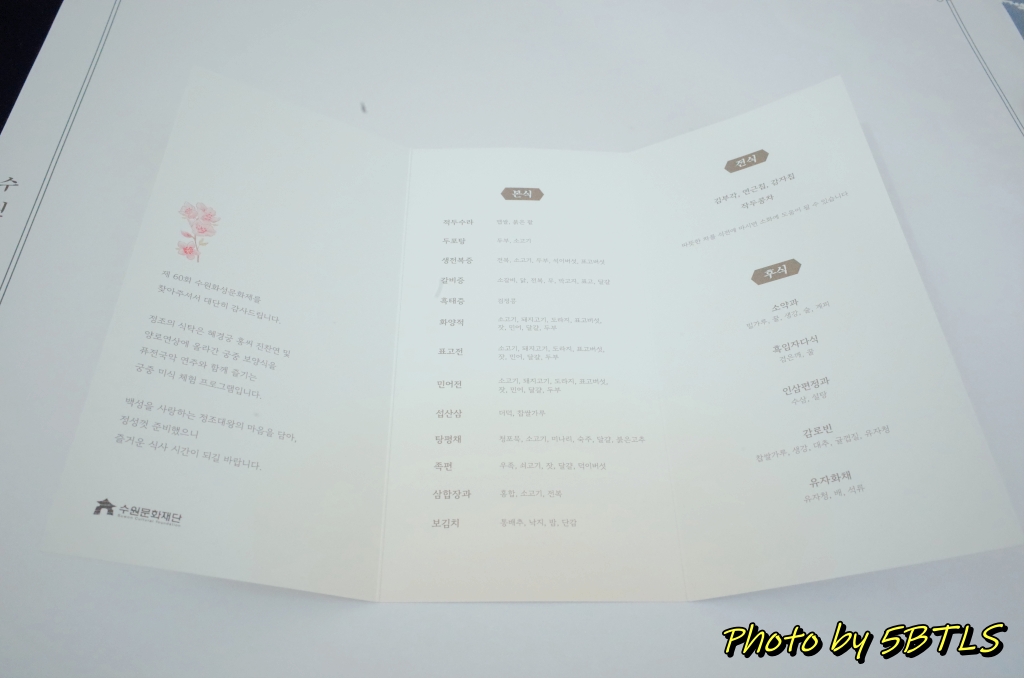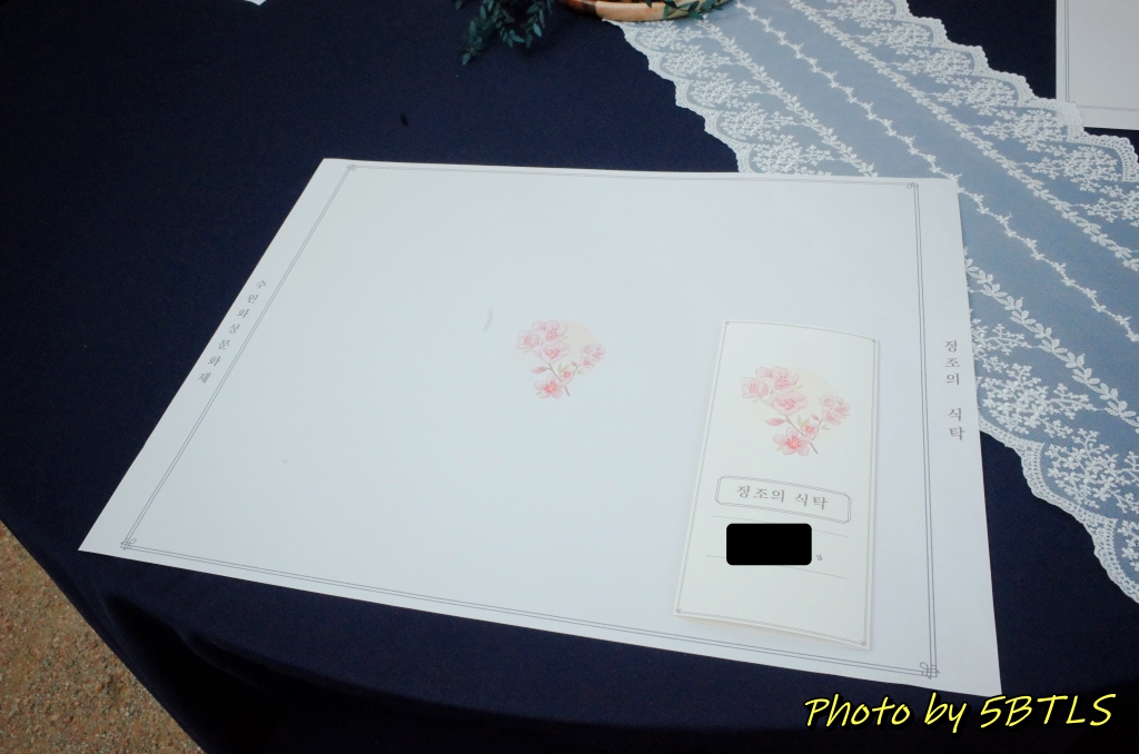 자리에 앉아 보니, 테이블에는 꽃 장식과 함께, 제이름이 적힌 리플릿이 있었고, 펼쳐 보니 오늘 제공될 음식들이 전식, 본식, 후식 별로 정리되어 있었습니다.