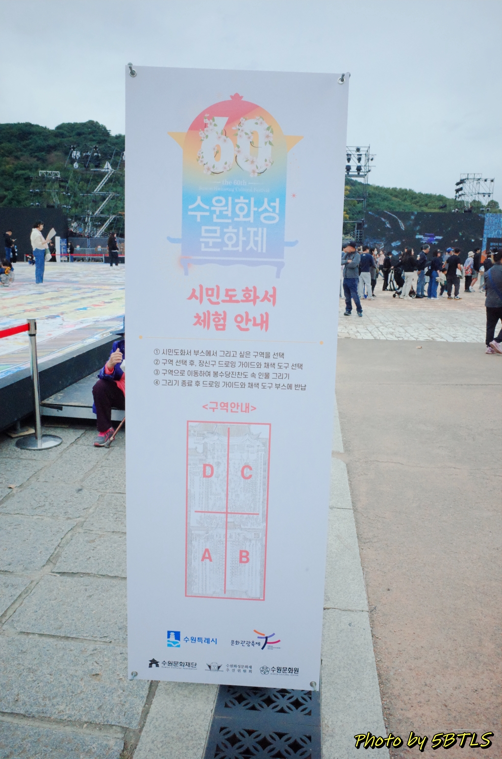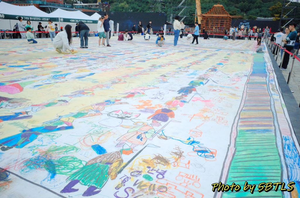 행궁광장 중앙 쪽, 그러니까 삼거리 쪽에는 대형 밑그림이 있고, 그 위에서 색칠을 하는 사람들이 있었습니다. 제가 가장 구경하고 싶었던 것 중에 하나였는데, 바로 '시민도화서'라는 행사였습니다. "을묘원행정리의궤"의 봉수당진찬도를 밑그림으로 해서 시민들, 관람객들이 이를 색칠해 나가는 건데, 뭔가 그냥 아이디어가 매력적이어서 사람들이 다들 앉아서 같이 작업하는 거 같은 걸 기대했는데, 이미 전날 많이 채색이 되어서인지, 아님 운영 시간이 얼마 안 되서인지, 사람들은 별로 없고, 그리고 아무래도 참석한 사람들의 연령들이 좀 어리다 보니... 귀여운 진찬도가 만들어지고 있더군요.