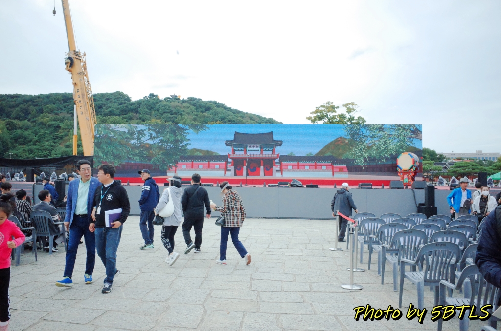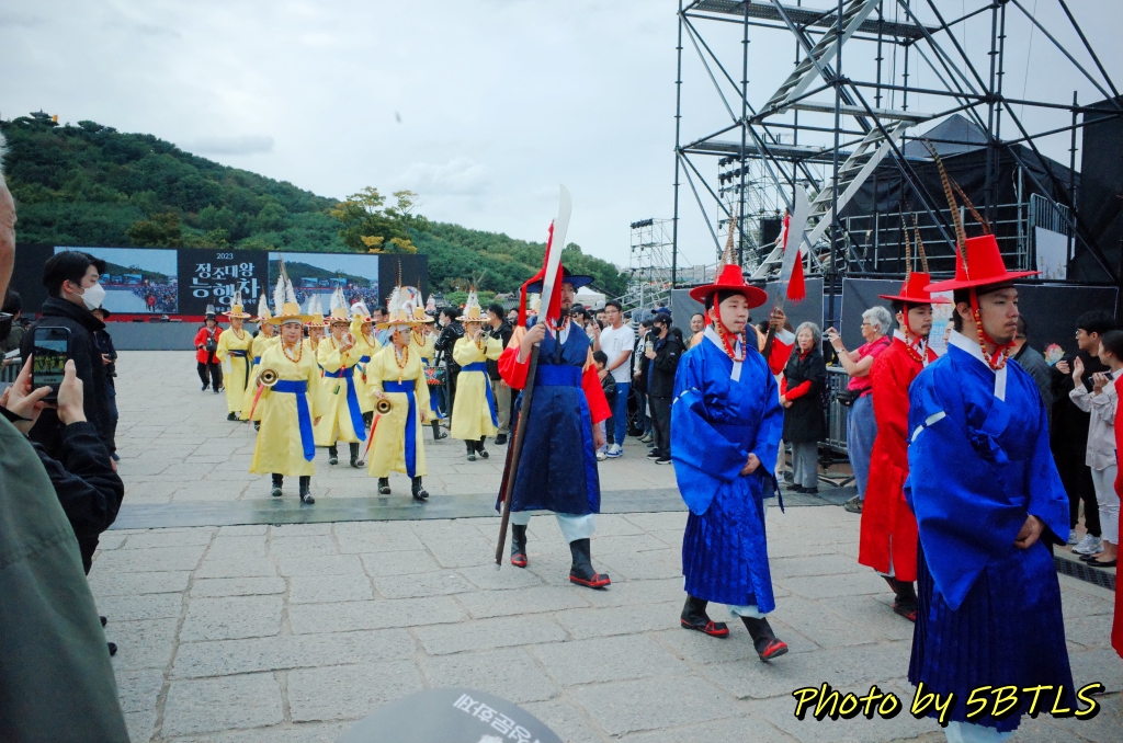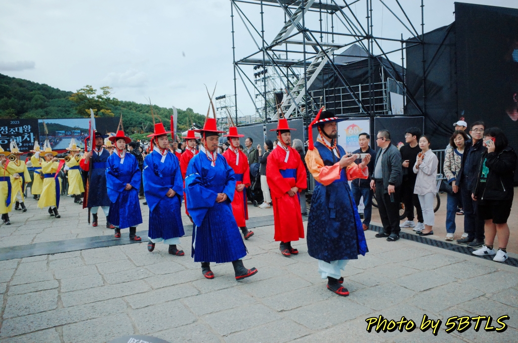 이동해서 보니, 제가 다음날 참여할 예정인 '정조대왕능행차 공동재현'행사 중에 '화성출궁'에 해당하는 재현행사가 진행중이었더군요. 이래저래 인파를 뚫고 가보니, 특별무대에서 뭔가를 하고는 거기서부터 관객석 중앙 통로를 지나서는 행궁광장 밖으로 이동하는 중이라서, 근처에 서서 사진을 찍었드랬습니다. 이건 전문배우들이 재현하는 거라서, 행렬은 그리 길지 않았구요. 보통 능행차 재현이라면서 나오는 영상에 찍히는 건, 제가 이 다음 날 직접 '시민체험행렬단'으로 간 부분이라 그건 다른 글에서 또 올려보겠습니다.