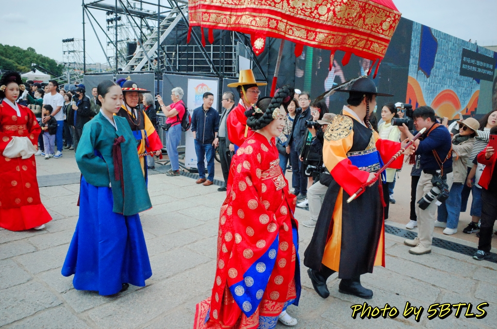 이동해서 보니, 제가 다음날 참여할 예정인 '정조대왕능행차 공동재현'행사 중에 '화성출궁'에 해당하는 재현행사가 진행중이었더군요. 이래저래 인파를 뚫고 가보니, 특별무대에서 뭔가를 하고는 거기서부터 관객석 중앙 통로를 지나서는 행궁광장 밖으로 이동하는 중이라서, 근처에 서서 사진을 찍었드랬습니다. 이건 전문배우들이 재현하는 거라서, 행렬은 그리 길지 않았구요. 보통 능행차 재현이라면서 나오는 영상에 찍히는 건, 제가 이 다음 날 직접 '시민체험행렬단'으로 간 부분이라 그건 다른 글에서 또 올려보겠습니다.