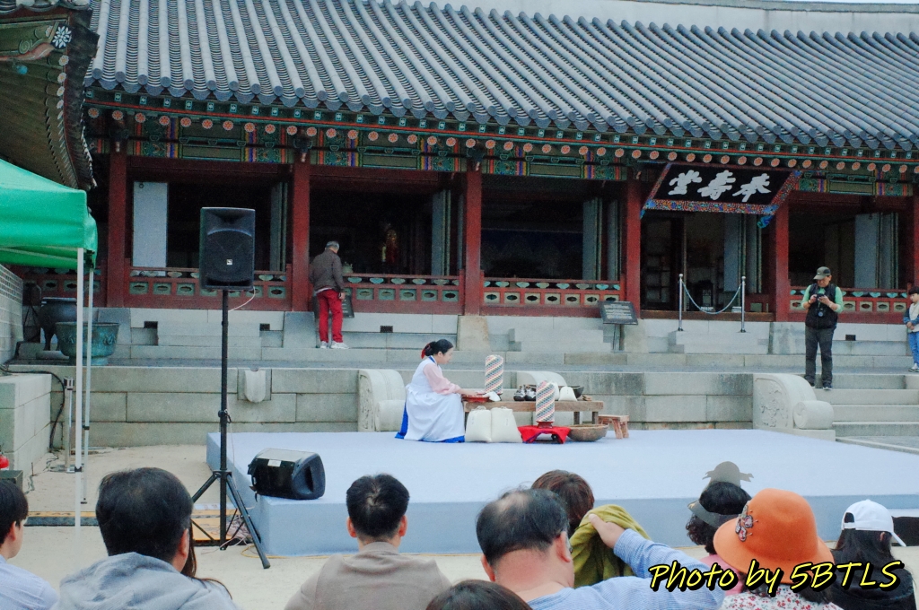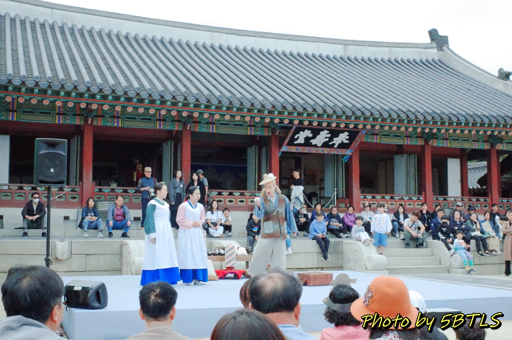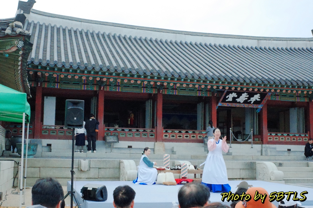 봉수당으로 가보니, 봉수당에서 장락당으로 가는 쪽으로 공연무대와 나무의자들이 놓여서는 다음 회차 공연을 기다리고 있더군요. 빈 의자에 앉아서 공연을 기다리고 있으니 공연시각이 되어서는 바로 이벤트가 진행되었습니다.