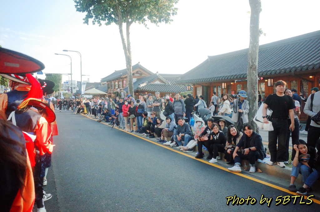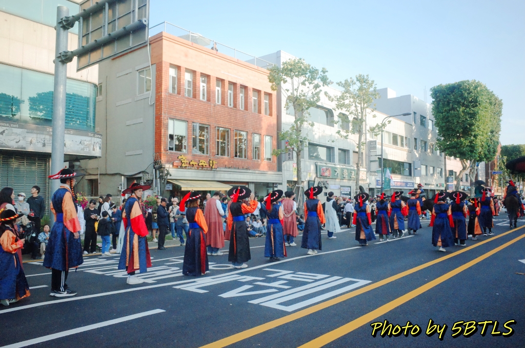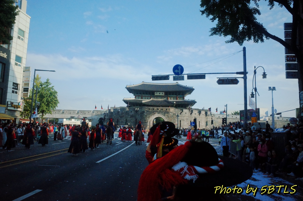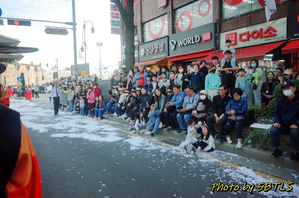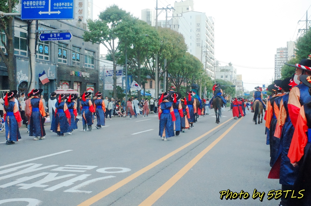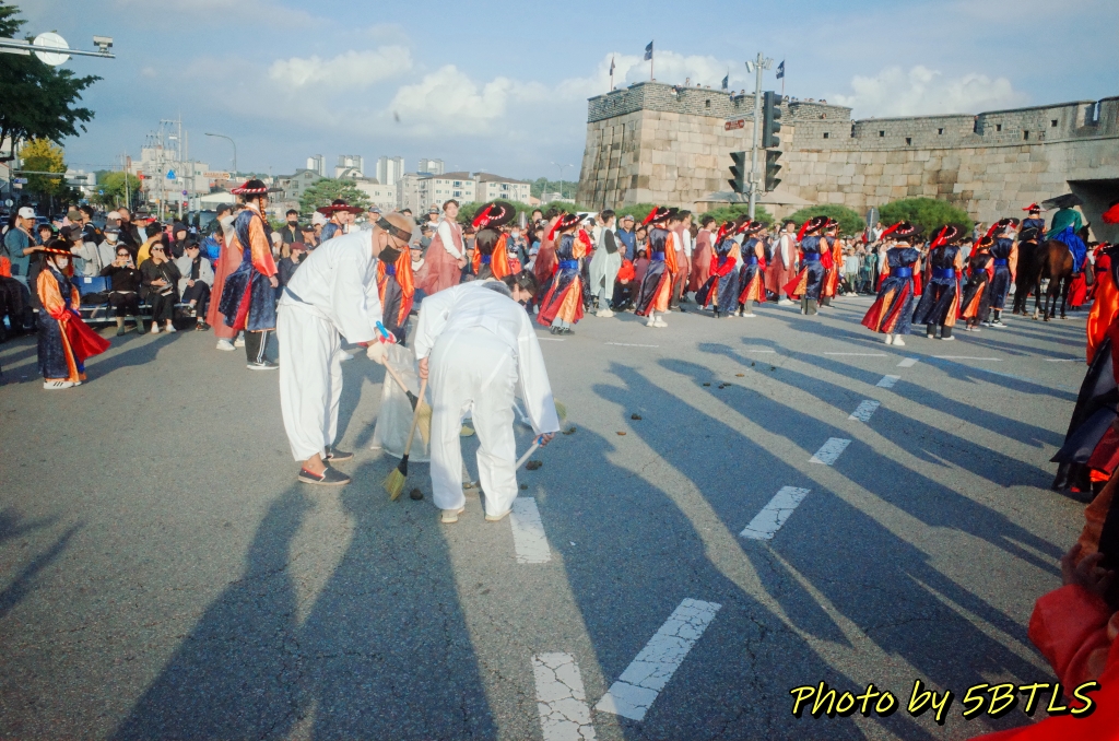 예정보다 늦었는지는 사실, 핸드폰으로 시간을 보지 않아서 모르겠네요. 핸드폰을 못 가지고 나오게 한 건 아닙니다. 재현행렬 참가자는 실제 반차도에 해당하는 행렬이므로 철저한 고증을 위해 핸드폰이나 카메라 등을 (소지는 할 수 있으나) 행렬 중에는 절대 꺼내지 못하게 했는데, 시민체험행렬은 반차도에 있는 행렬 자체는 아니므로 편하게 카메라나 휴대폰을 꺼내 사진이나 영상을 찍거나, 시민들한테 손을 흔들어 인사를 해도 된다고 안내를 받았거든요. 그래서 저는 아예 소형 카메라를 들고 아래 사진들을 좀 찍고 하며 오히려 시민들을 보며 즐겼습니다. 작년에는 행렬의 구성이 어떻게 되었는지 전체를 보는 걸 즐겼다면, 이번에는 제가 반대로 참가자로서 구경하는 이를 구경하는 걸 즐겼다고 할까요 ㅎㅎㅎ 암튼 종합운동장부터 천천히 걸으면서 시민들도 보고, 또 지나간 말들의 흔적도 보고 (^^) 하면서 장안문을 지나 화성행궁까지 천천히 산책하듯이 즐겁게 걸었습니다. 손도 흔들기도 하고 ㅎㅎㅎㅎ. 특히나 제 앞의 어린 여자 아이가 있어서, 관람하시는 시민 분들이 너무나 반가워하고 환영해주는 바람에 저도 덕분에 기분도 즐거웠네요.