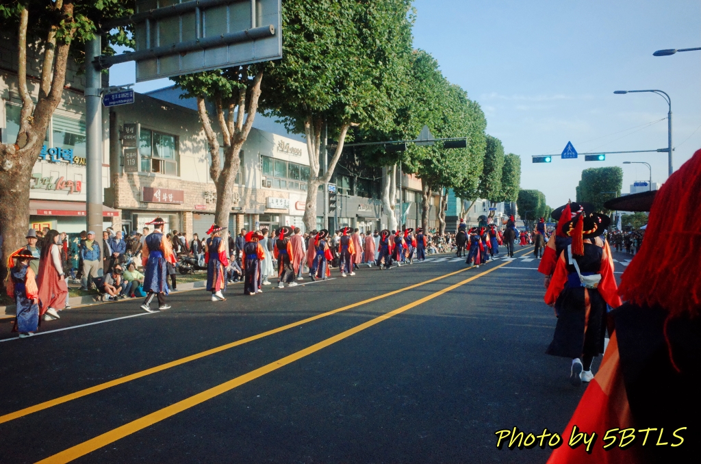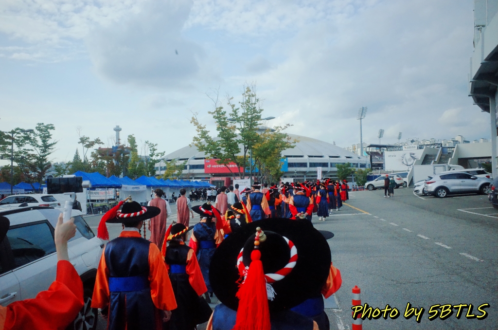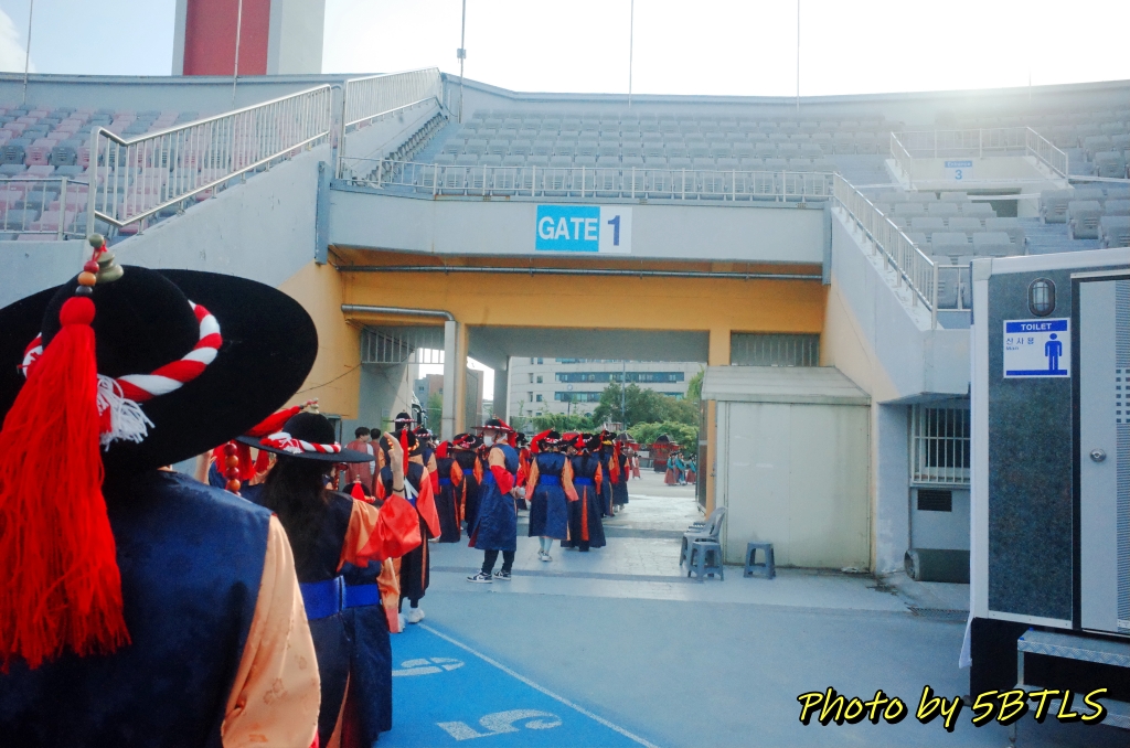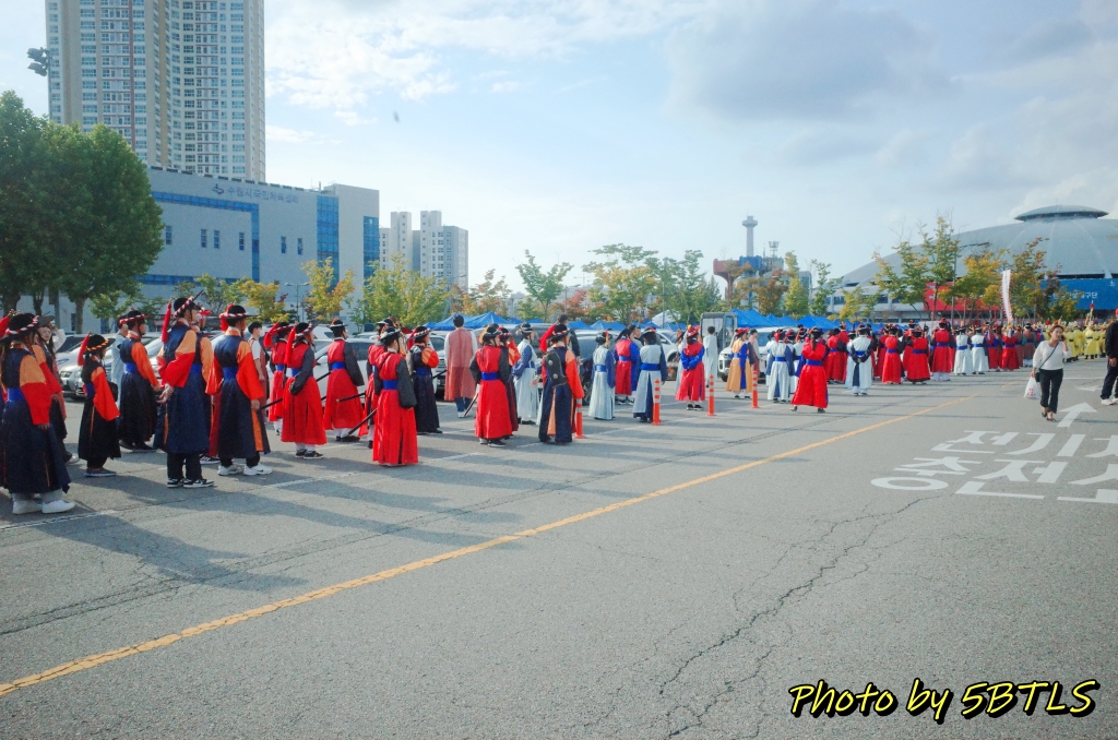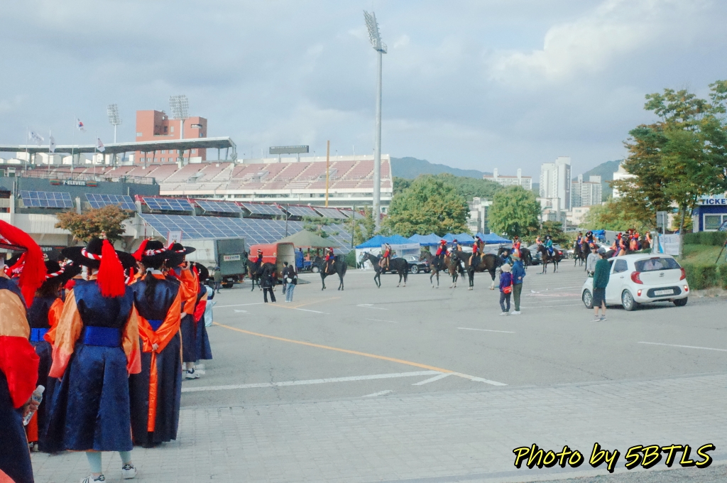 드디어, 2팀의 행렬이 출발하기 시작하니, 앞쪽에서도 이동하기 시작하고, 저희도 조금씩 조금씩 전진하기 시작해서 드디어 운동장 밖으로 나가게 되었습니다. 운동장 바깥으로 나가니 바로 앞 주차장 쪽에는 우리의 뒤를 따라 올 시민 퍼레이드를 참여하는 이들이 대기 중에 있었구요, 조금씩 이동하다 보니 저희 앞쪽에 서서 가게 될 주요 배역 분들과 말을 탄 참가자들이 대기하다가 저희 앞 앞쪽에 들어와서는 행렬의 앞쪽에서 전진하기 시작하더군요. 거기에 맞춰서 저도 드디어 전진해서는, 종합운동장 단지를 벗어나서 행렬을 기다리는 시민 분들이 있는 차로로 나갈 수 있었습니다.