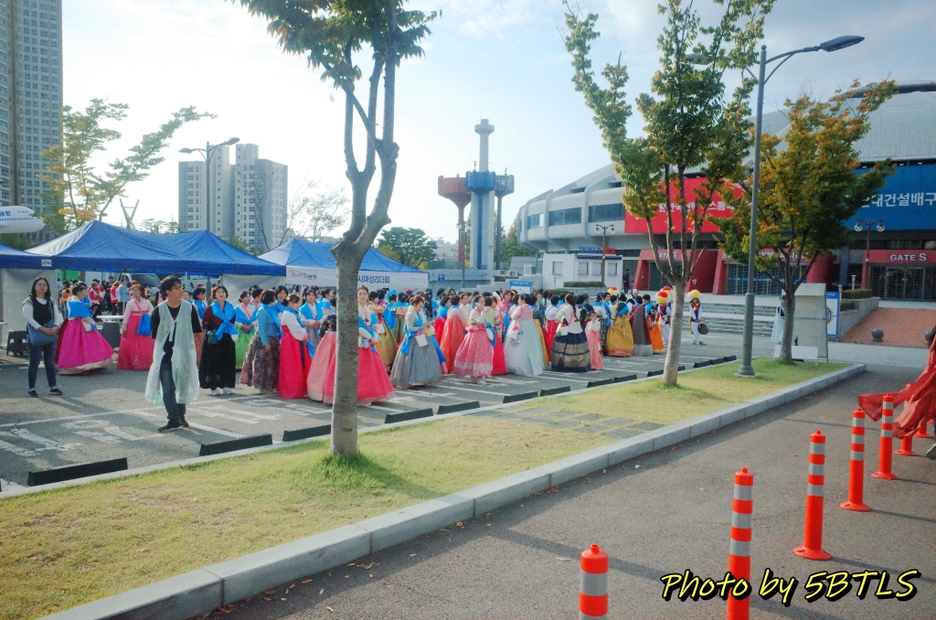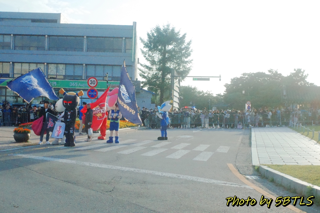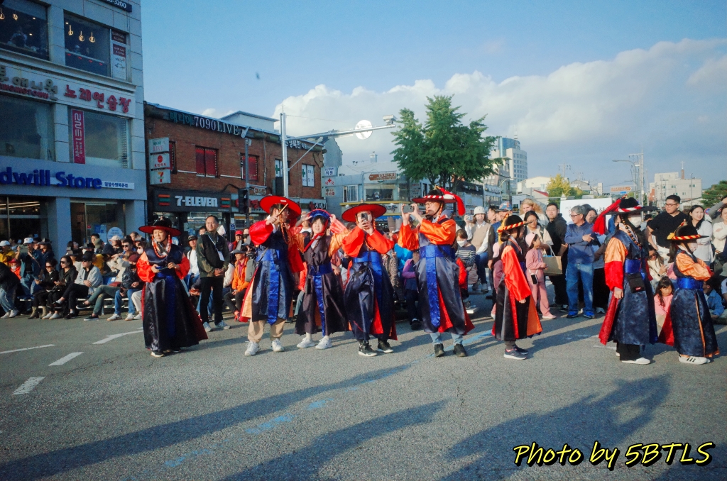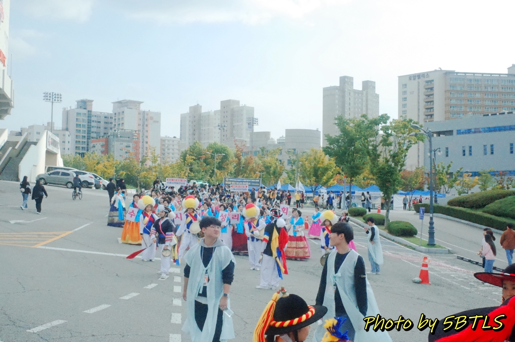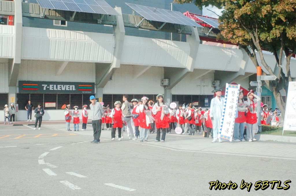 드디어, 2팀의 행렬이 출발하기 시작하니, 앞쪽에서도 이동하기 시작하고, 저희도 조금씩 조금씩 전진하기 시작해서 드디어 운동장 밖으로 나가게 되었습니다. 운동장 바깥으로 나가니 바로 앞 주차장 쪽에는 우리의 뒤를 따라 올 시민 퍼레이드를 참여하는 이들이 대기 중에 있었구요, 조금씩 이동하다 보니 저희 앞쪽에 서서 가게 될 주요 배역 분들과 말을 탄 참가자들이 대기하다가 저희 앞 앞쪽에 들어와서는 행렬의 앞쪽에서 전진하기 시작하더군요. 거기에 맞춰서 저도 드디어 전진해서는, 종합운동장 단지를 벗어나서 행렬을 기다리는 시민 분들이 있는 차로로 나갈 수 있었습니다.