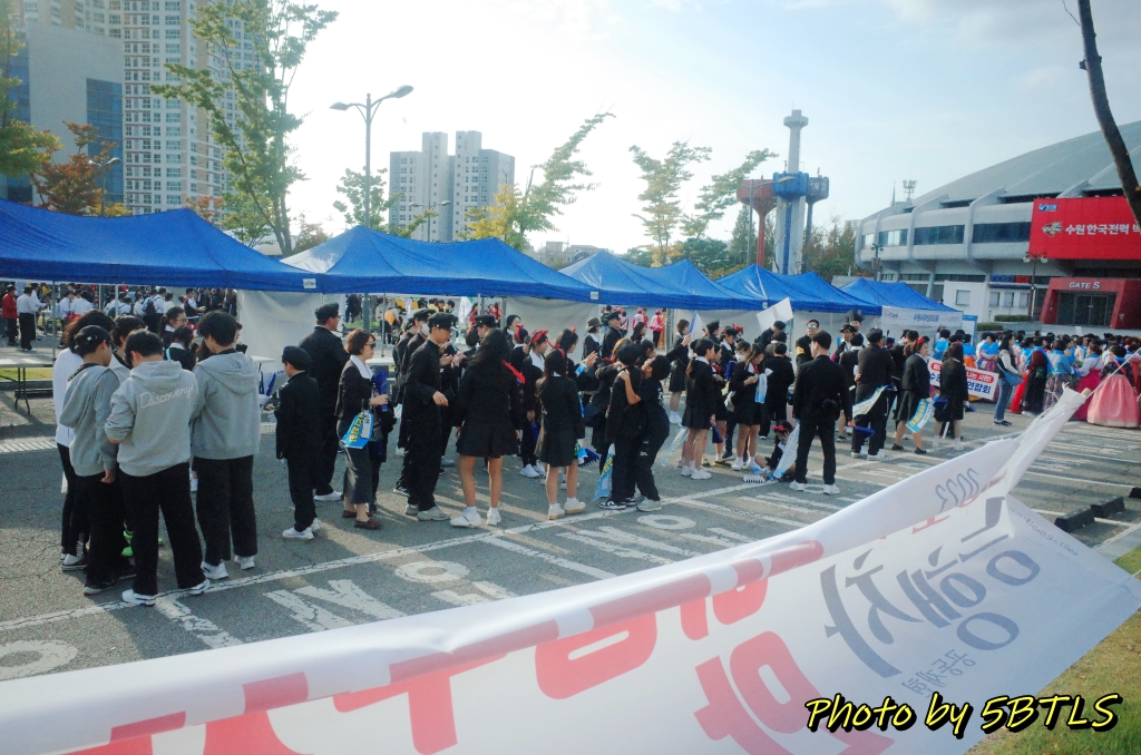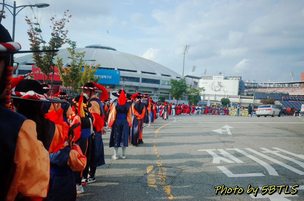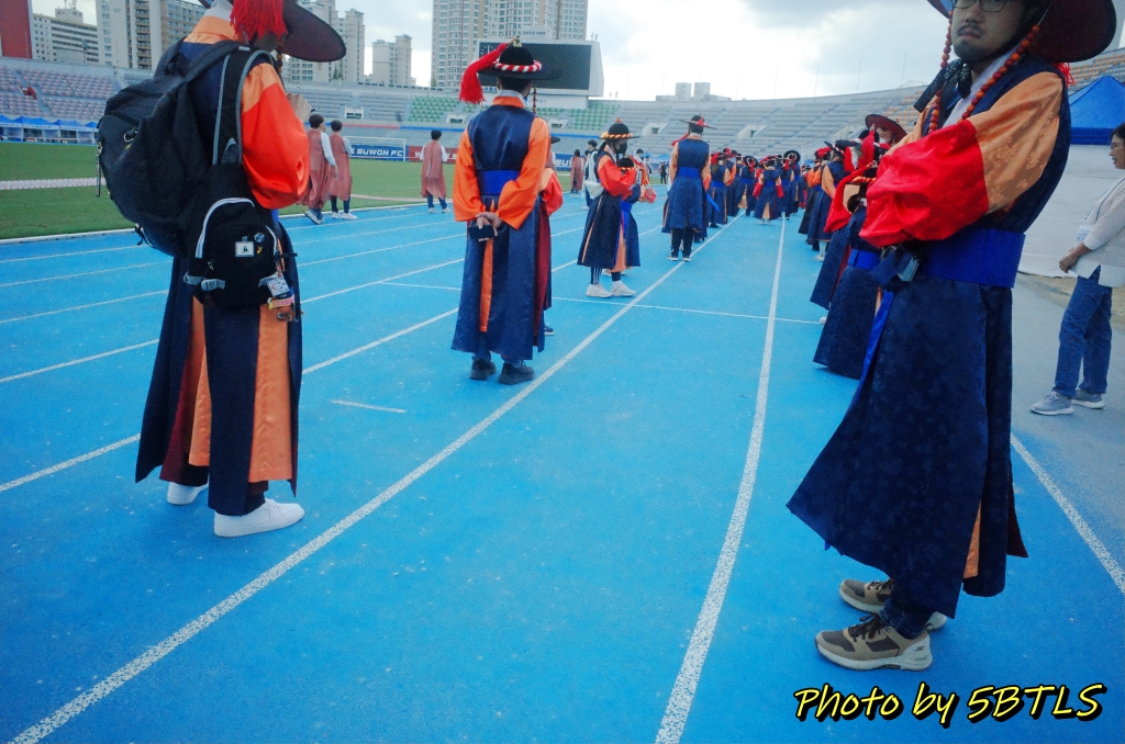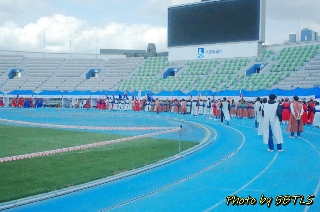 운동장에 도착하고 실제로 행렬로 출발하기 전에 대열을 맞춰 서는 것을 준비하기 시작할 때까지는... 적어도 1시간 반 정도는 기다렸던 거 같네요. (^^) 수원에서 진행되는 '반차도 재현행렬'은 지지대 고개에서 노송지대를 지나 종합운동장까지 우는 행렬에 참여하는 "1팀"이 있고, 종합운동장에서 장안문을 지나 화성행궁까지 가는 "2팀"이 있는데, 제가 참여한 '시민재현행렬'과 '시민퍼레이드'는 2팀에만 있습니다. 1팀이 종합운동장이 있는 단지로 들어오면, "재현행렬"은 1팀에서 2팀으로 바뀌면서, 출발하고, 그 "재현행렬" 뒤에 저희 "시민체험행렬"과 "시민퍼레이드"가 차례대로 뒤를 이어 나가는데요..