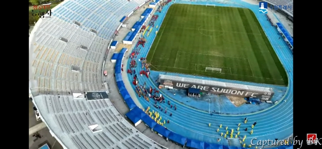 예정대로 시간이 되서 참여자는 각자의 텐트 앞으로 나와서 서 있으라는 얘기에 나와서 줄을 서보니, 정말 많은 분들이... (윗 사진 참조) 근데, 이 분들이 실제로 걸을 때 앞 뒤로 거리를 둔 상태로 열 맞춰 걸어야 하니, 그 열을 맞춘다고 하다 보니, 이 운동장 안에 있는 참여자(시민 퍼레이드는 운동장 밖에서 대기 중이었어요) 중에서 가장 뒤에서 걸어가는 게 저희이다 보니 계속 뒤로 밀리고 밀리고 밀려서는.... 거의 운동장 반의 반바퀴를 뒤로 밀려 났네요. 그러고 나서는 재현행렬에 해당하는 앞 부분 부터, 2팀의 재현행렬 출발 점에 해당하는 종합운동장 단지의 동문 근처에서부터 열을 맞추기 위해 이동하다 보니, 조금씩 조금씩 앞으로 이동했습니다. 하지만, 1팀의 종합운동장 도착이 조금 지연되고, 또 그에 맞춰서 주요 배역(정조, 혜경궁 홍씨, 채제공 등등)과 그 사이 사이에 들어갈 재현 행렬을 맞추는 게 조금씩 지연되다 보니 가장 뒤에 있던 저희는 운동장 안에서 조금 오래 기다려야 했고, 가을이지만, 구군복에 무거운 전립을 쓰고 있다 보니, 부모를 따라 온 초등학생 참가자들은 조금씩 지쳐 가기 시작하기도 했내요.