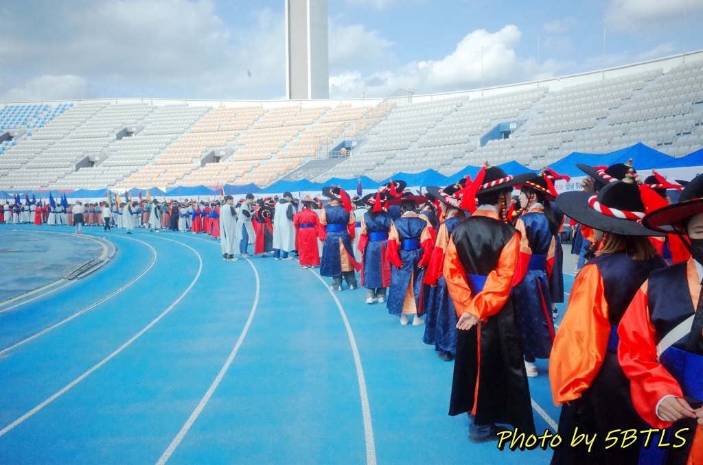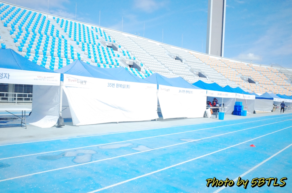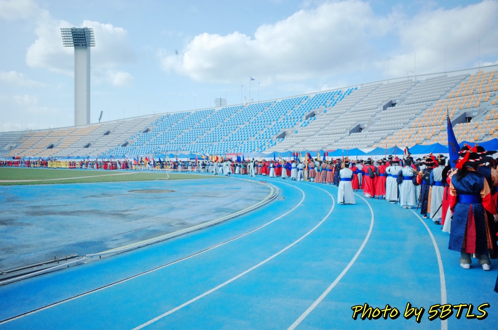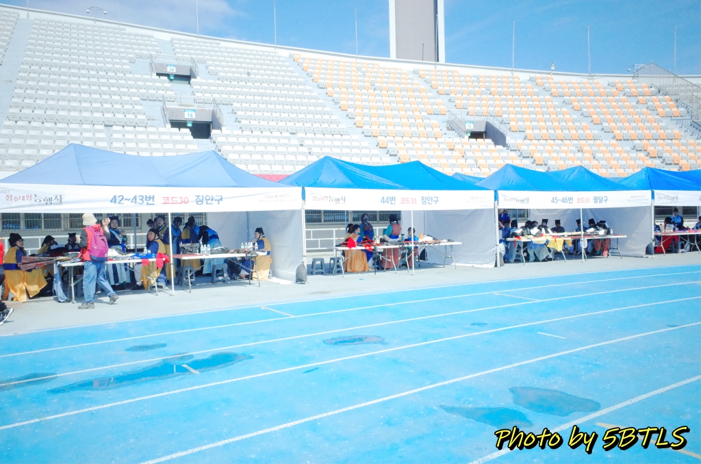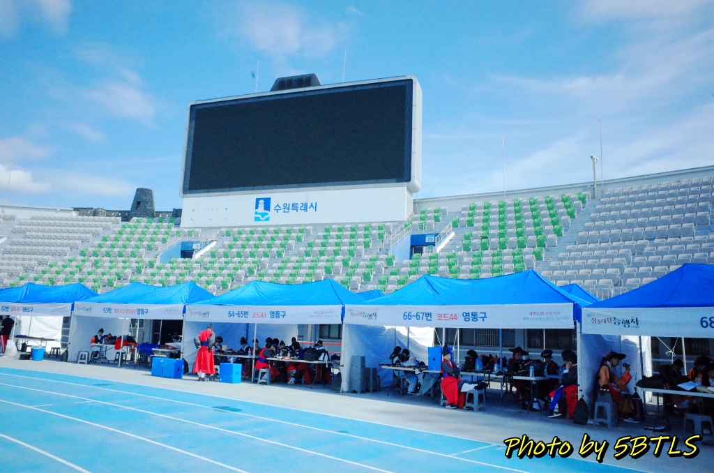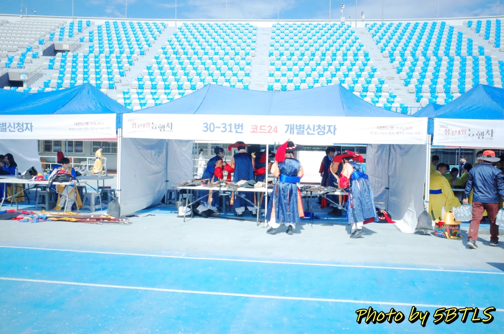 그리고 도착한 종합운동장 건물 안 실제 운동장에는 트랙을 따라서, '반차도 행렬'을 재현하는, 각 파트별로 집결/대기하는 텐트들이 있더군요. 트랙 전체에 걸쳐서 텐트가 있을 정도였고, 실제로 3주 전 교육을 받을 때 들은 얘기에도 제가 참여한 '시민재현행렬'은 24명이지만, 실제 '반차도 재현행렬'은 1,000명이 넘고, '시민퍼레이드은 500 여명 정도라고 했었으니, 정말 많은 분들이 대기를 하더군요. 일단 '시민재현체험단' 텐트를 찾아 갔더니 가장 먼저 도착한 뒤, 제가 행렬 때 입어야 할 옷도 찾고 도착했다는 걸 알리러(출석하러) 행사 진행팀이 있는 텐트로 이동했습니다. 근데, 행사 진행도 관리 대상에 따라서 여러 텐트가 있어서, 저희 '시민재현체험단'을 담당하는 텐트를 또 돌아다녀야 했네요. (^^)