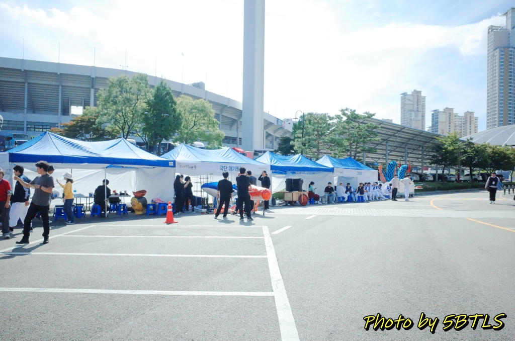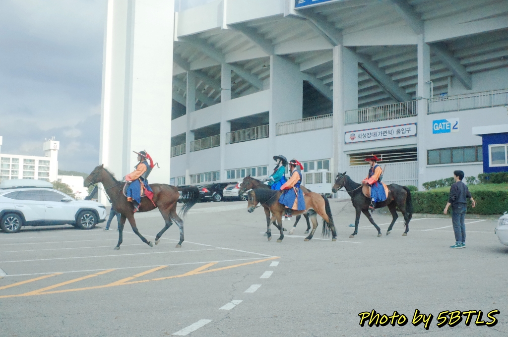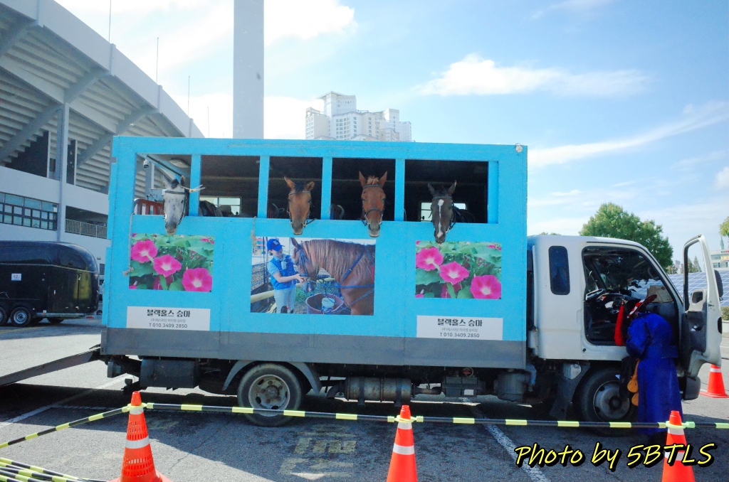 그러고는 행사 당일인 10월 9일에 집결 마감시간인 오후 1시보다도 20분 일찍 집결 장소인 수원종합운동장에 도착했습니다. 야구장 근처 쪽으로 입장했는데, 거긴 재현행사의 시민 페러이드로 참여하시는 분들이 대기하는 텐트들과 그 분들이 가져온 각종 장비들이 있더군요. 사실 야구장 내부를 제외한 야구장 옆과 실내체육관 쪽 주차장에는 이 시민 퍼레이드 행렬에 참여하시는 분들이 각 단체별로 대기하는 텐트들과 또 그 분들이 각각의 테마로 준비한 퍼레이드를 출발 전 대기를 하는 장소로 활용되었습니다. 그리고 야구장과 축구장 사이의 공간 중 축구장에 가까운 쪽에는 반차도 재현행렬에 참여하는 말들이 전부 트럭 안에서 대기를 하고 있더군요. 이 곳을 지나면서, '아, 오늘 정말 퍼레이드가 있구나'하는 느낌에 기분이 업되기 시작했습니다.