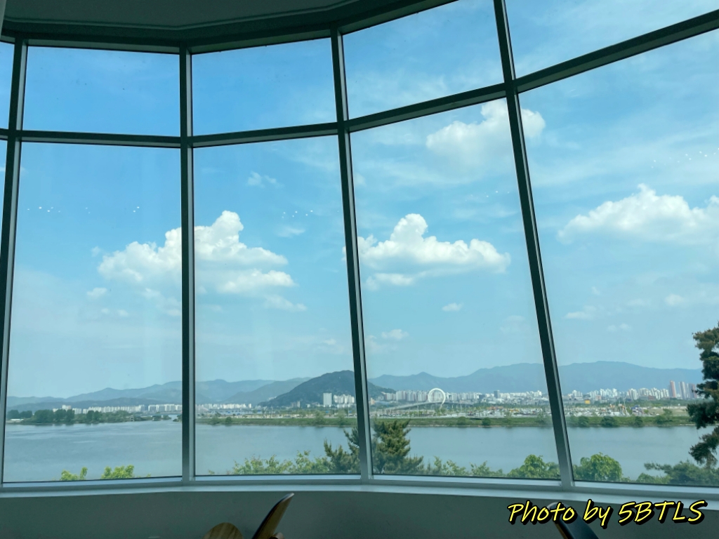박물관과 토이로봇관을 다 구경하고는 토이로봇관 제일 윗층에 있는 카페에 들렀습니다. 더운 여름인데 실내이기도 하고, 통창 유리 밖으로 소양강이 내려다 보이는 전망이 멋지더군요. 그리고, 외부 공간도 있긴 해서, 바람 부는 가을에는 여기도 시간 보내기 괜찮은 공간인 듯 했습니다.