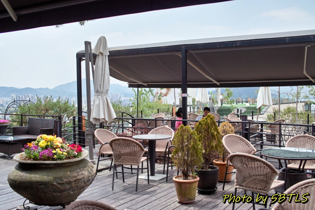 춘천시내 동남쪽에 있는 구봉산 자락의 전망대 근처에는 춘천 시내를 내려다 보는 View 가 좋은 카페들이 많다고 해서, 춘천 여행의 마지막을 이리로 잡아 봤는데요. 나름 큰 책장으로 유명한 쿠폴라라는 베이커리 카페를 들렀습니다. 도로 변에서 들어가면 아래 사진의 2층 천장까지 닿는 서재가 보이는 카페 내부가 보이는데, 이 계단을 타고 올라간 2층으로 나간 야외 석에서는 춘천 시내가 보이는 멋진 전망을 즐길 수 있더군요.