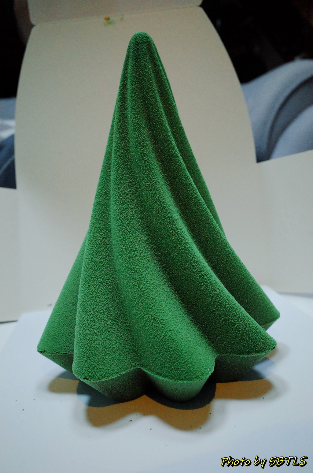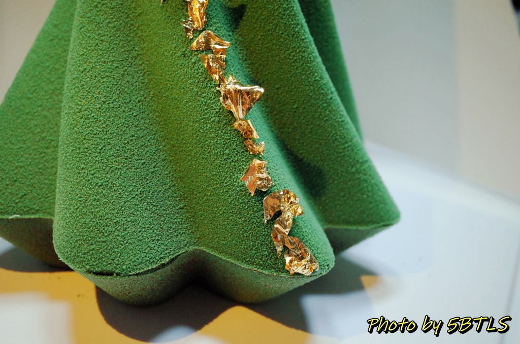 일단 시그니처 트리 케이크는 커다란 케이크 상자에 담긴 걸 위 쪽으로 잘 열어 오픈하니까. 정말 이쁜 녹색의 트리가 하나가... 약간 돌아가는 모양으로 내려오는 나무결도 잘 표현되어 있고, 그리고 그중에 한 라인은 금박 스티커 같은 게 결 따라 내려와서 정말 이뻤습니다.