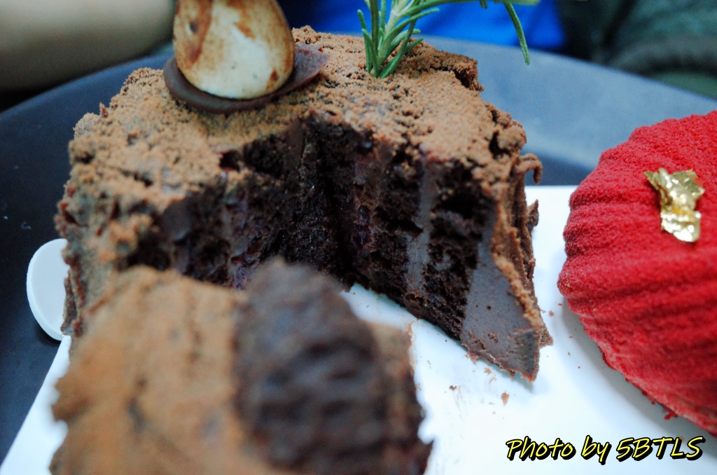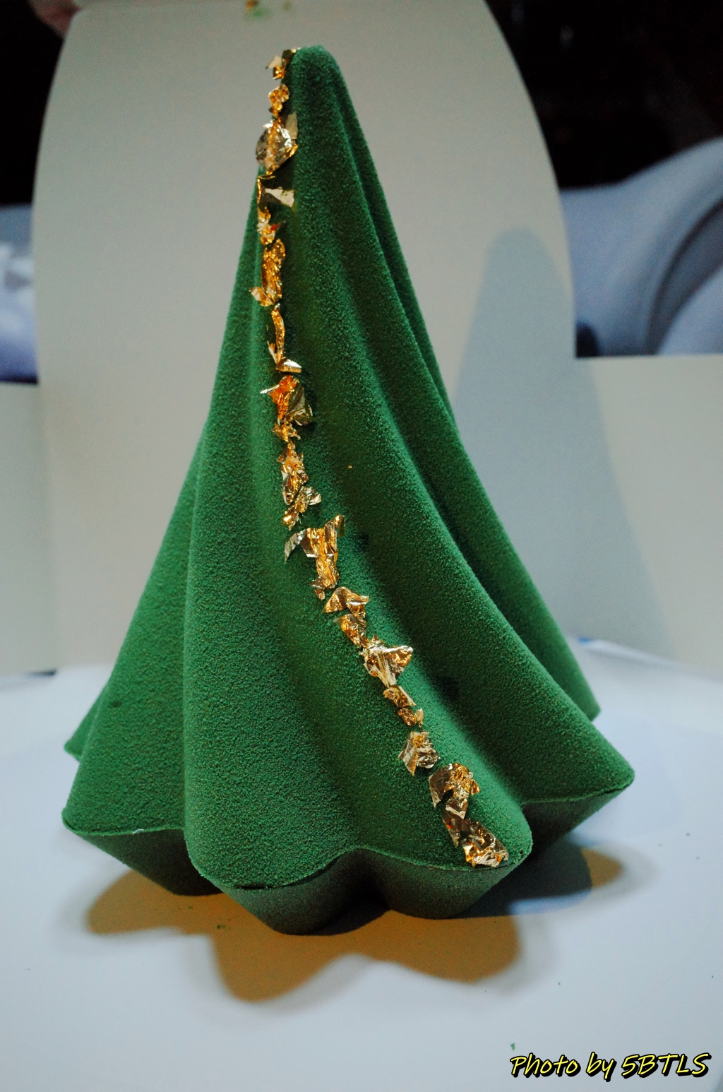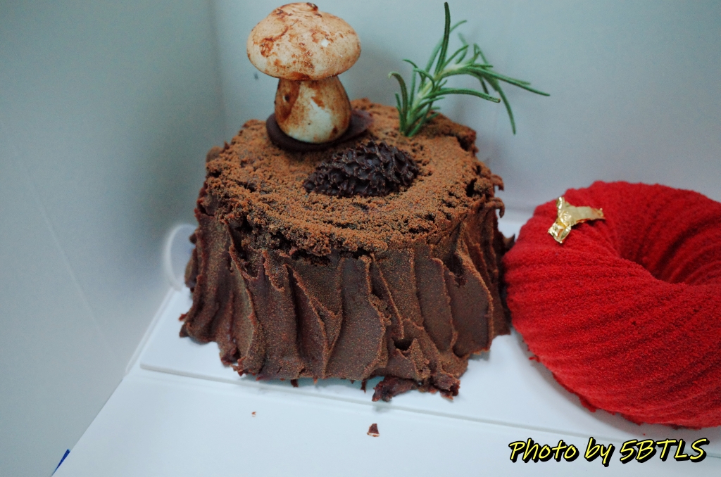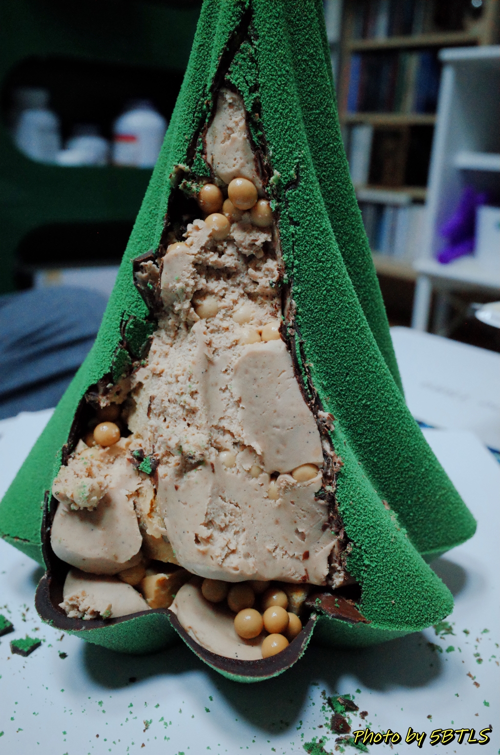 이게 아래쪽에서 보니, 그리고 이걸 케이크 칼로 자르려고 보니, 일반적인 케이크를 만드는 게 아니라 이 케이크를 뒤집어서 마치 아이스크림 콘처럼 뒤집어서 케이크 속의 초콜렛, 바닐라빈이랑 견과류들을 채우고는, 아래판을 두껑처럼 덮은 다음에 잘 봉합해서는 다시 트리 모양처럼 뒤집은 거 같더군요.
