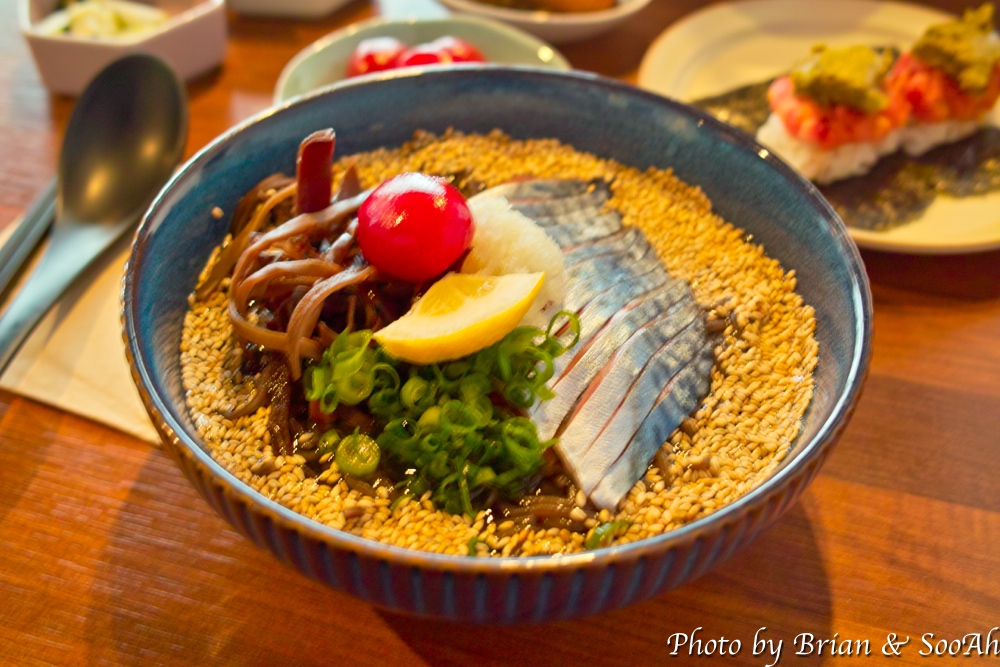 고등어소바는 위에 보이는 참깨와 아래에 숨겨진 성게의 콜라보로 피넛버터를 먹는 듯한 달콤함이 좋았습니다. 그리고 개인적으로 좋아하는 고등어회와 소바의 식감이 잘 어울리더군요.