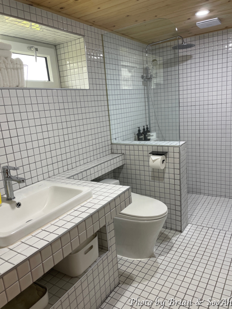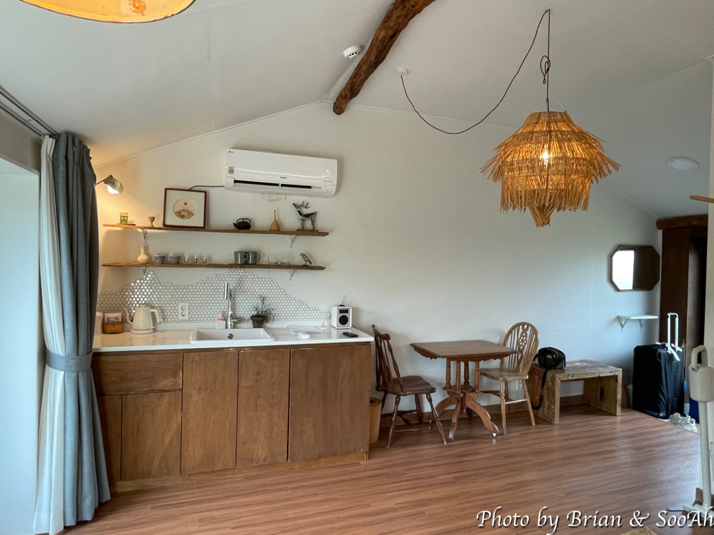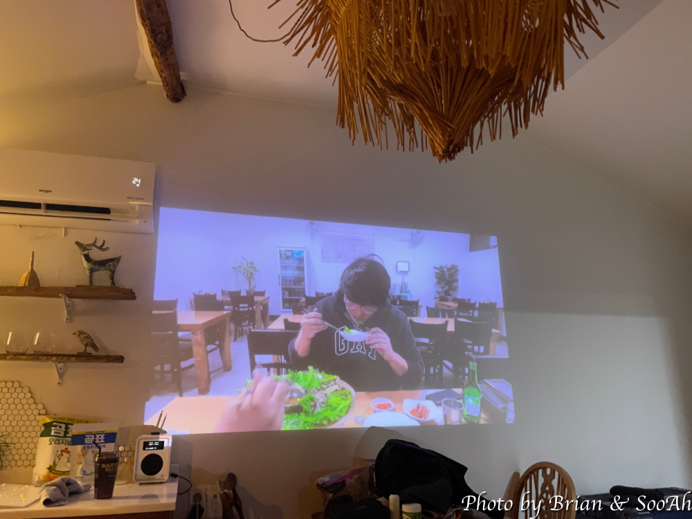 침대 옆으로, 즉 들어가는 입구에서 정면으로 바라보면 벽 대부분이 유리창으로 되어 있는데, 방향이 서쪽이라 저녁 때 햇볕이 들더군요. 물론 짙은 커튼으로 잘 가려져서 대낮에도 햇볕이 거의 안 들게 잘 가려지더군요. 그리고, 옆 방과의 사잇벽이 되는 공간에는 싱크대와 간단한 요리를 할 수 있게 전기 포트나 이런 게 있었습니다. 그리고 TV가 없는 대신 조그만 프로젝터가 있어서, 가져간 모바일 기기를 연결해서 보시면 되더라구요.