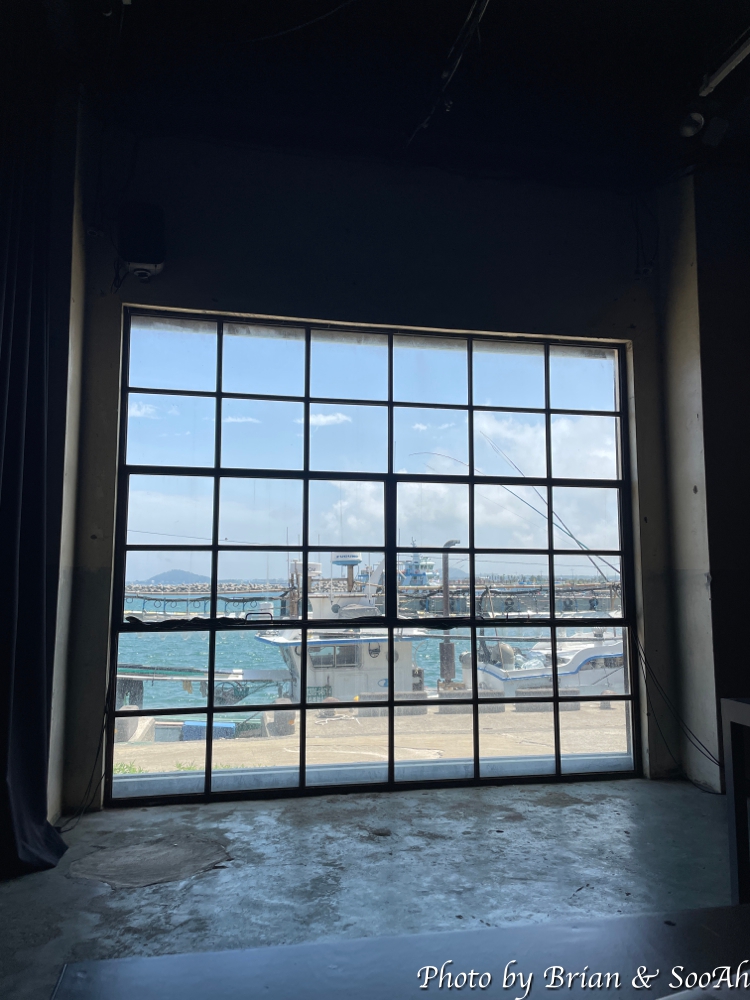 예전 어촌 창고의 외형은 그대로인 채인 건물이 바로 점심 식사를 하러 간 곳인데요. 점심만 먹는 건 아니고 공연이랑 토크쇼 같은 게 병행 진행되는 그런 체험형 공간입니다. 아직 오픈 시간이 되지 않아서 앞에 입간판으로 시간만 공지되어 있어서, 차를 주차하고는 조금 기다리고 있었더니, 저 문이 열리고, 직원분들이 예약자를 확인하더니, 미리 지정해둔 좌석에 앉혀 주시더군요.
