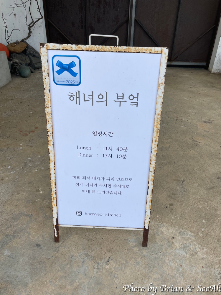 예전 어촌 창고의 외형은 그대로인 채인 건물이 바로 점심 식사를 하러 간 곳인데요. 점심만 먹는 건 아니고 공연이랑 토크쇼 같은 게 병행 진행되는 그런 체험형 공간입니다. 아직 오픈 시간이 되지 않아서 앞에 입간판으로 시간만 공지되어 있어서, 차를 주차하고는 조금 기다리고 있었더니, 저 문이 열리고, 직원분들이 예약자를 확인하더니, 미리 지정해둔 좌석에 앉혀 주시더군요.