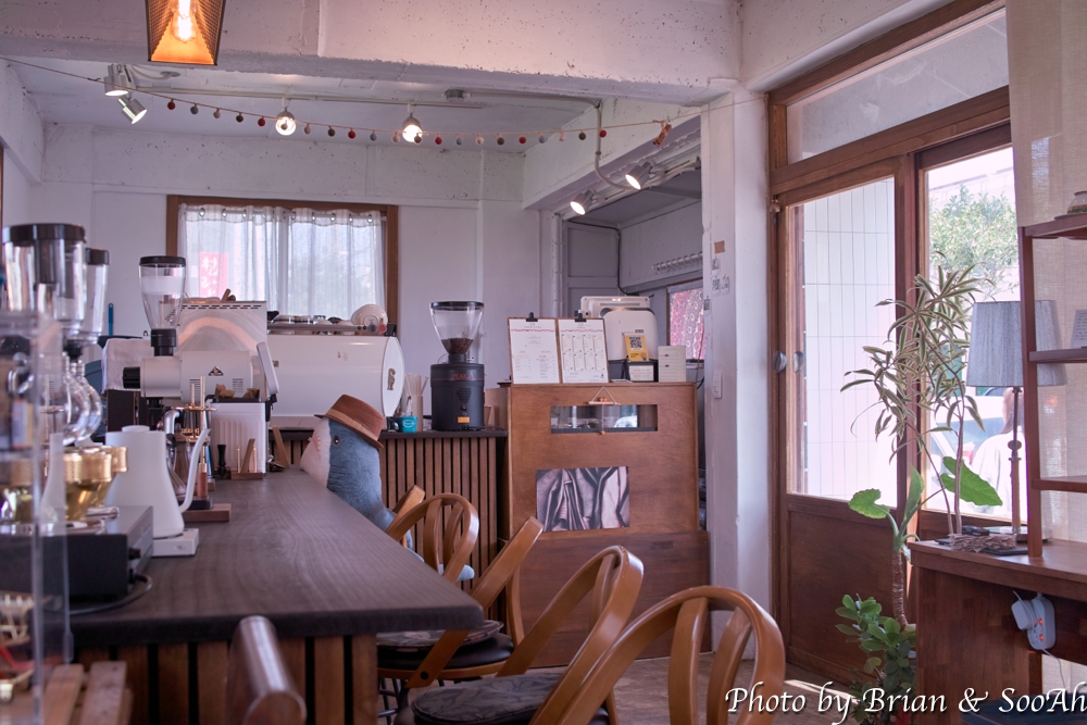 옛 읍내 시장에 있을 법한 건물의 1층에 가로로 긴 직사각형 구조의 카페인데, 한쪽에 진열된 커피원두들과 다른 한편에는 바처럼 되어 있는 자리가 있는 게 특색있는 인테리어였습니다. 그리고 안쪽에는 편히 앉을 수 있는 자리들이 있더군요.