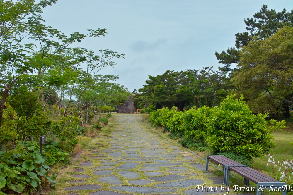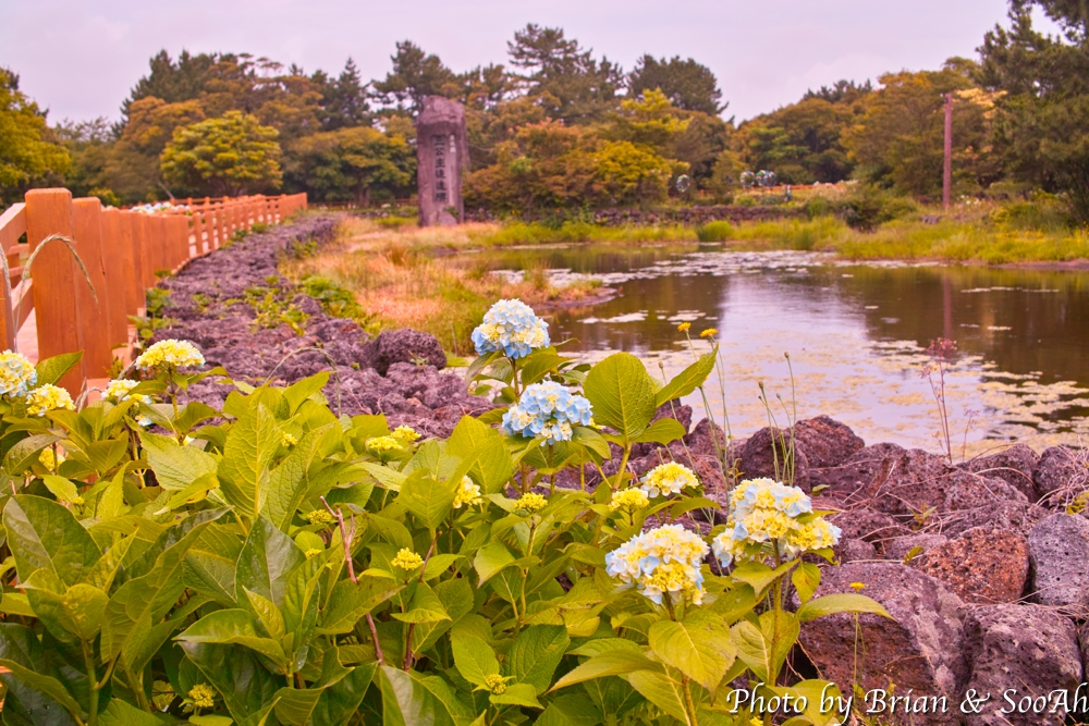 일단은 시계방향으로 걷기 시작하다 보니, 안쪽으로는 잔디 들판이 펼쳐져 있고, 낮게 수국들이 펜스처럼 둘러쳐져 있더군요. 그 곳을 지나 더 더 걸어가니 연못이 있더군요. 이 곳이 제주의 세 성씨 시조들이 혼인을 한 장소라는 설화가 있는 곳인데요. 나름 연못이 좀 규모가 되더군요. 연못을 따라 있는 산책로를 걸으면서 수국과 나무들을 구경했네요.