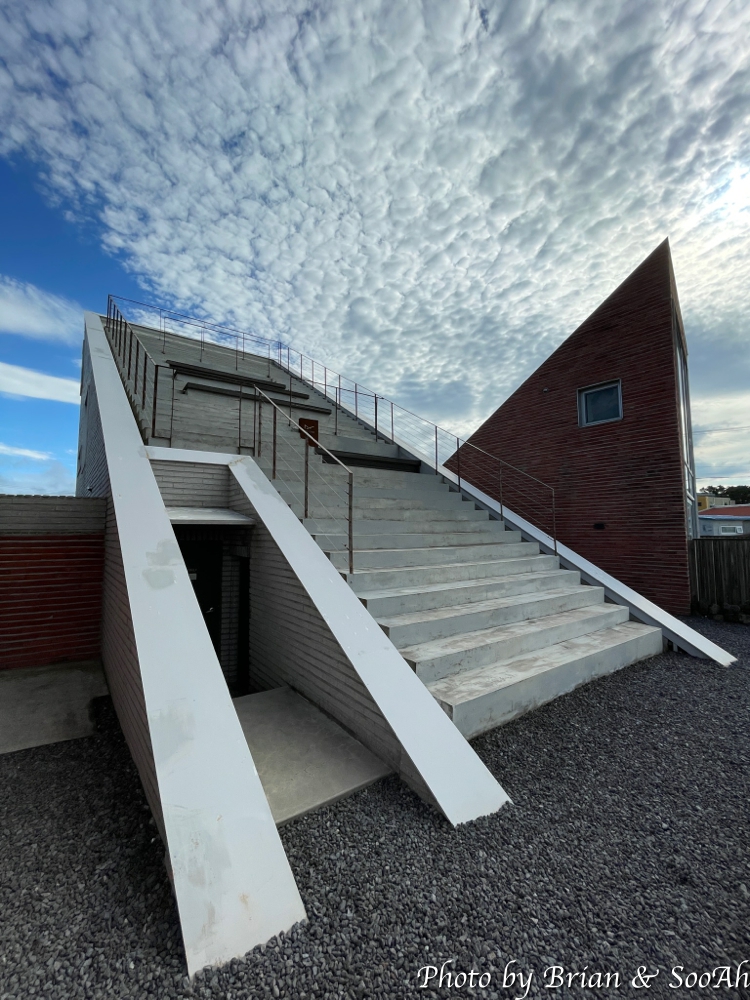 숙소 얘기를 좀 더 하려구 하네요. 숙소 1동과 2동 사이에는 오름이라고 하는 건물이 하나 있는데요. 말 그대로 올라가서 보는 전망대... 같은 건물이었습니다. 근데, 이게 마치 어렸을 때 학교 운동장에 있던 스탠드 같은 시멘트 느낌으로 가파르게 올라가다 보니, 뭔가 정겹기도 하고.... 숙소 내 복층에서 바라보는 것도 좋지만, 이렇게 유리 없이 그냥 탁 트인 주위를 바라 보는게 너무 좋더군요. 사실 높은 건물들이 없다 보니 이 정도 높이에도 마을 전체가 다 보이는...