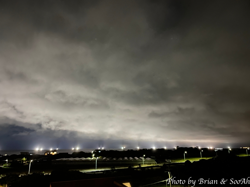 근데 여기가 밤에 나오니 밤바다를 바라 볼 수 있는... (물론 모기도 있지만) 운치 있는 곳으로 변하더군요. 저녁 식사를 포장해온 고등어회를 먹고 난 다음에 바람을 쐴 겸 나와 봤더니, 평대 바다 너머로 등을 켜놓고는 한치잡이를 하는 일렬로 배치되어 작업중인 어선들을 보자니 '아 정말 제주에 있구나' 하는 느낌도 들고 너무 좋았습니다.