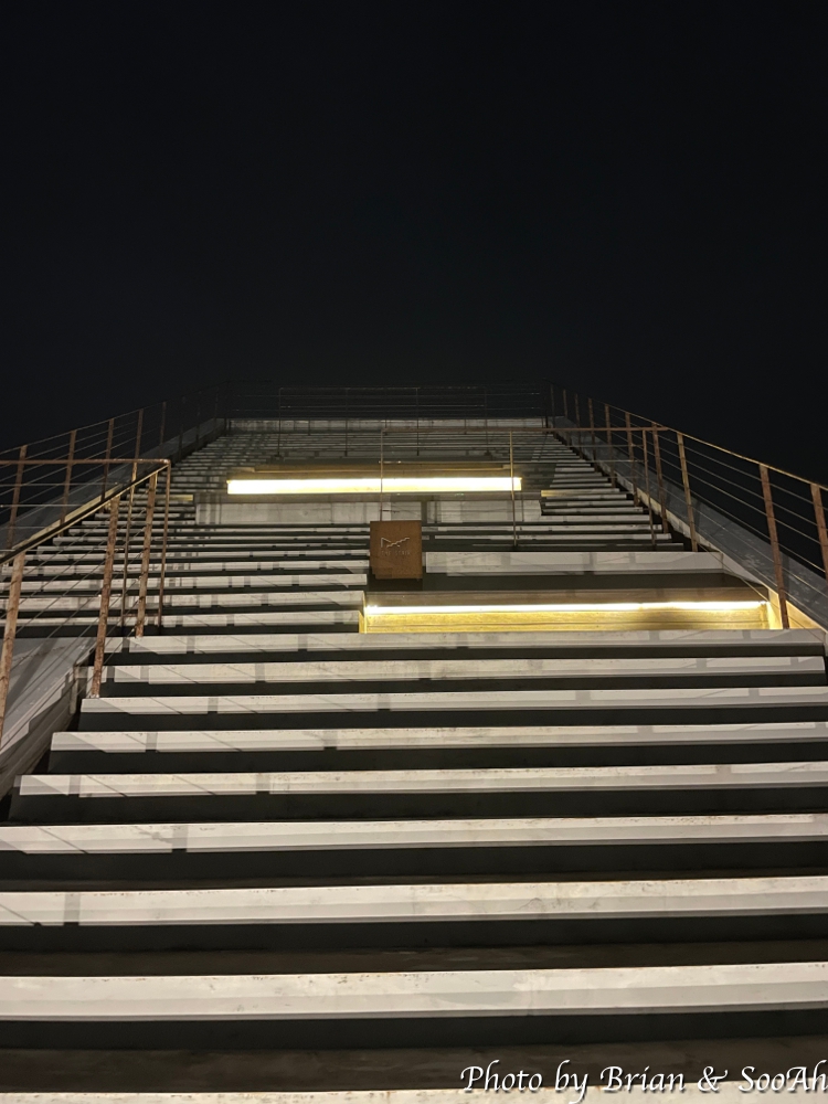 숙소 얘기를 좀 더 하려구 하네요. 숙소 1동과 2동 사이에는 오름이라고 하는 건물이 하나 있는데요. 말 그대로 올라가서 보는 전망대... 같은 건물이었습니다. 근데, 이게 마치 어렸을 때 학교 운동장에 있던 스탠드 같은 시멘트 느낌으로 가파르게 올라가다 보니, 뭔가 정겹기도 하고.... 숙소 내 복층에서 바라보는 것도 좋지만, 이렇게 유리 없이 그냥 탁 트인 주위를 바라 보는게 너무 좋더군요. 사실 높은 건물들이 없다 보니 이 정도 높이에도 마을 전체가 다 보이는...