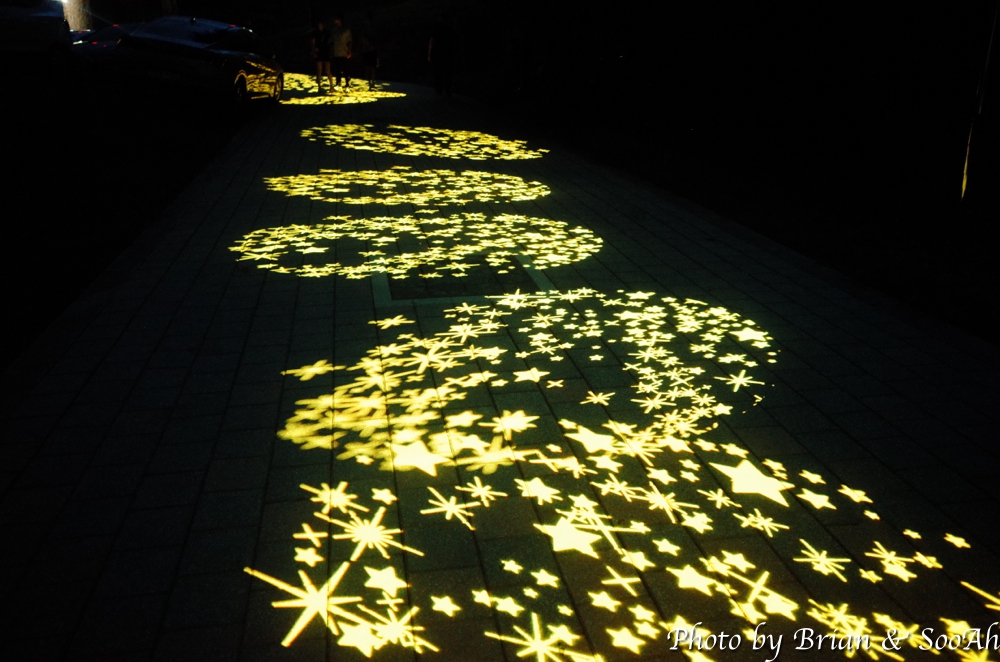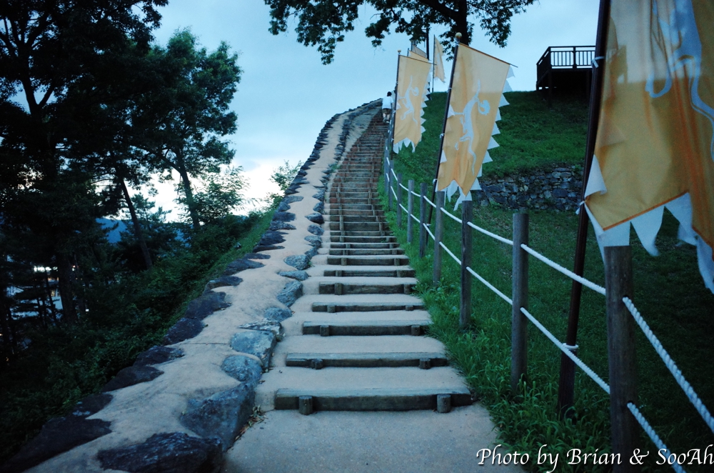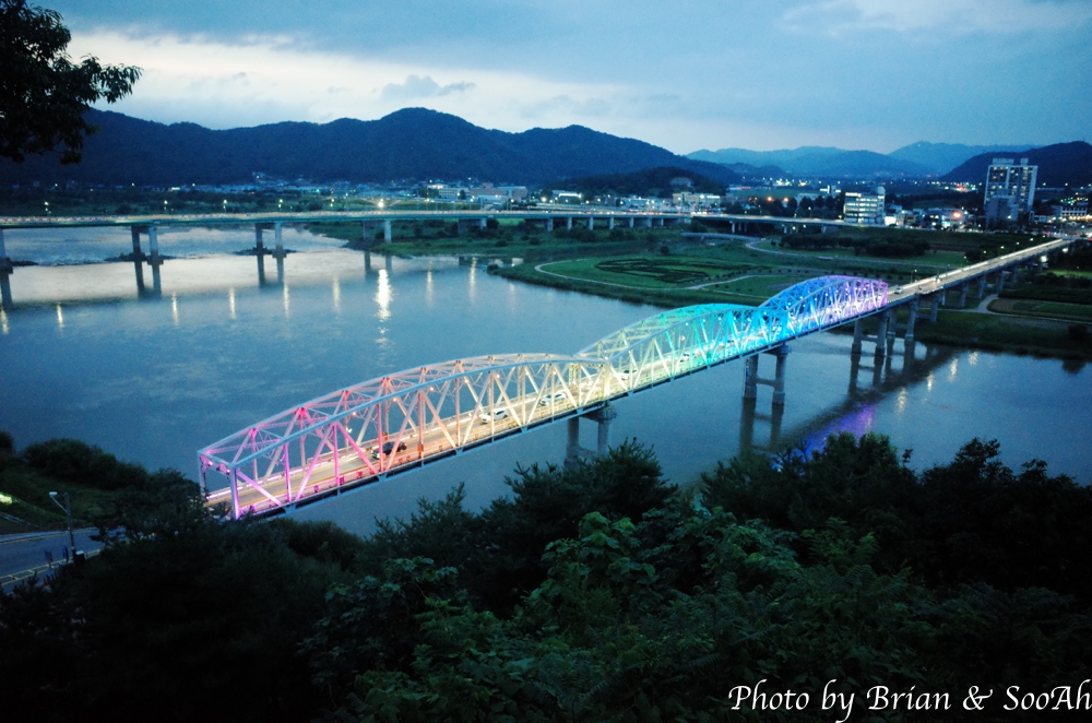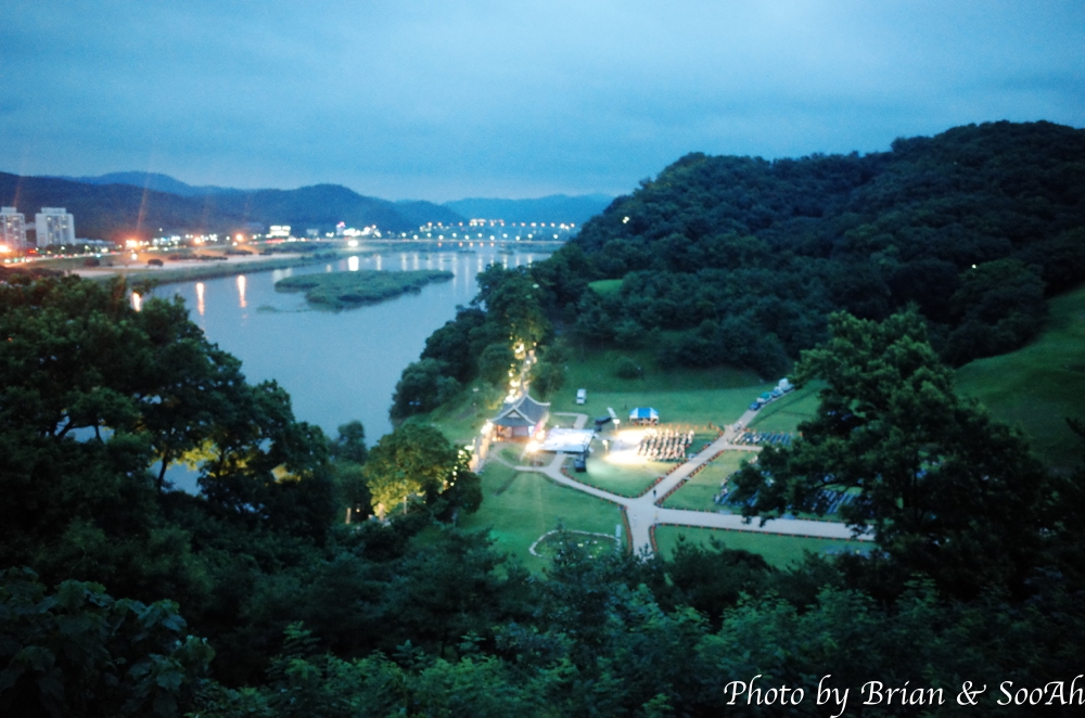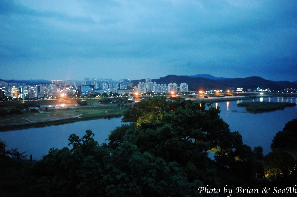 산성 정문을 들어간 다음 바로 강가를 따라 언덕으로 올라가는 성벽 길을 따라 올라가면, 바로 강과 건너편의 신시가지가 보이는 야경이 등장합니다.