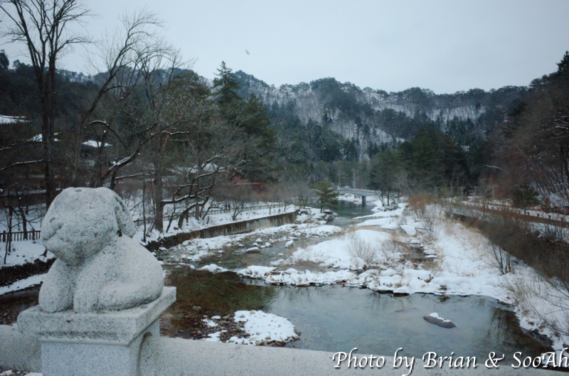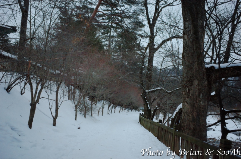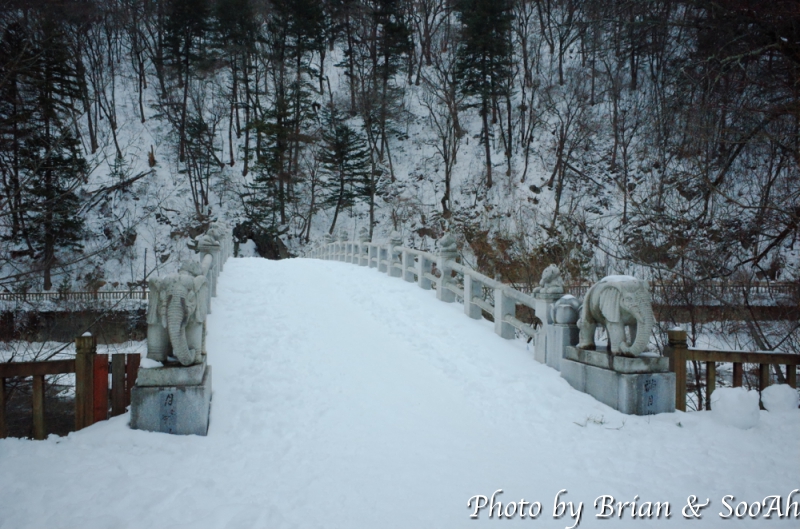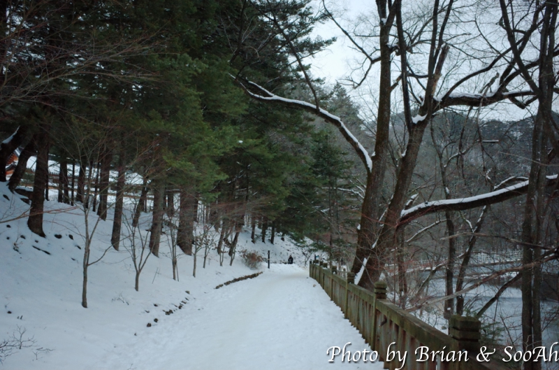 월정사 경내를 구경하고 나와서는 사천왕문을 나와서는 내려온 길에, 개천을 따라서 올라가는 산책길을 걷기 시작했습니다. 그냥 개천과 눈덮인 나무를 배경으로 사진도 찍고 좀 분위기도 즐기려고 꽤나 걸어 올라갔는데요.