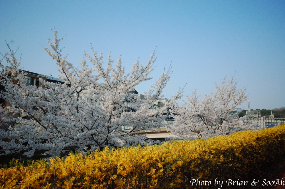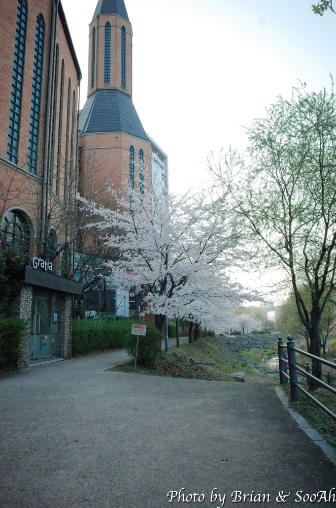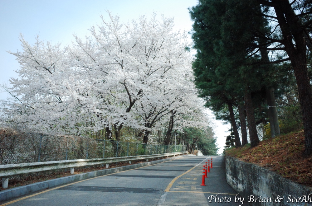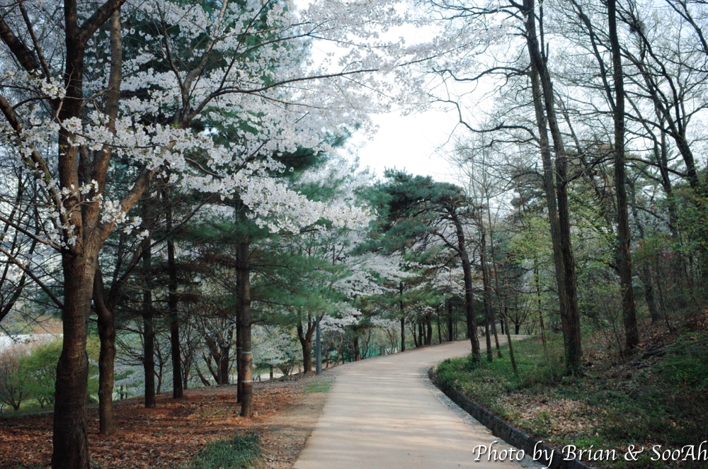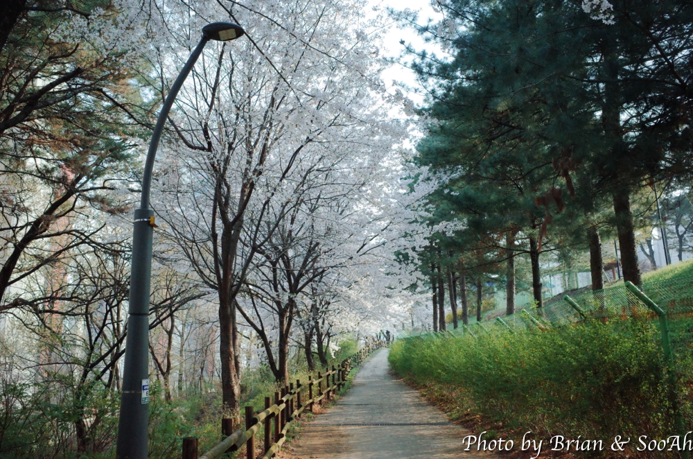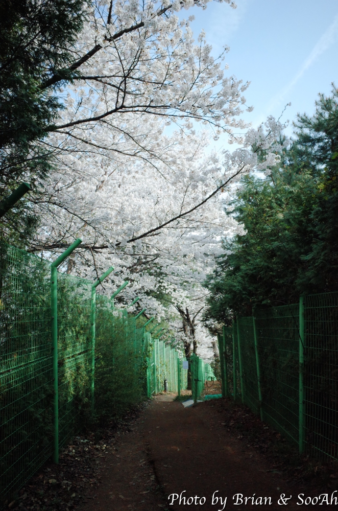 일단 집에서 버스를 타고 경기대 내에 종점에 도착해서는 걷기 시작했습니다. 경기대 캠퍼스 옆으로 난 언덕길을 올라가니, 동수원 IC에서 창룡문 사거리로 넘어올 때 보이던 높은 아치형 통로 위로 지나가게 되더군요. 수원외고와 경기남부경찰청 사이로 난 올라갔다 내려갔다 하는 고갯길을 넘다 보니, 때마침 벚꽃 시즌이라 벚꽃 구경은 잘 했네요.