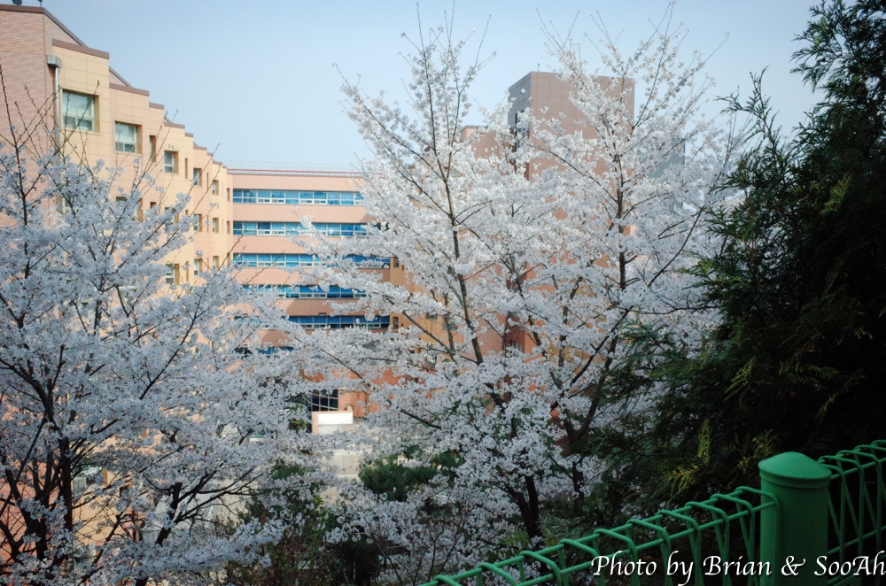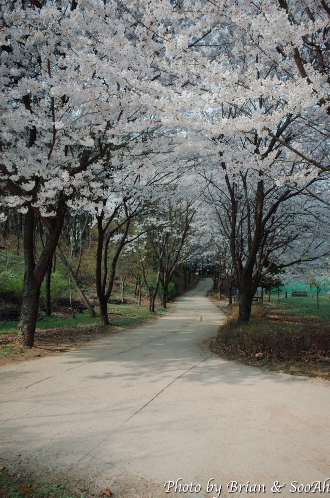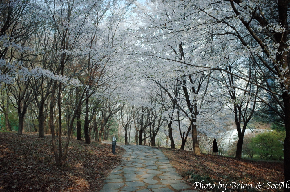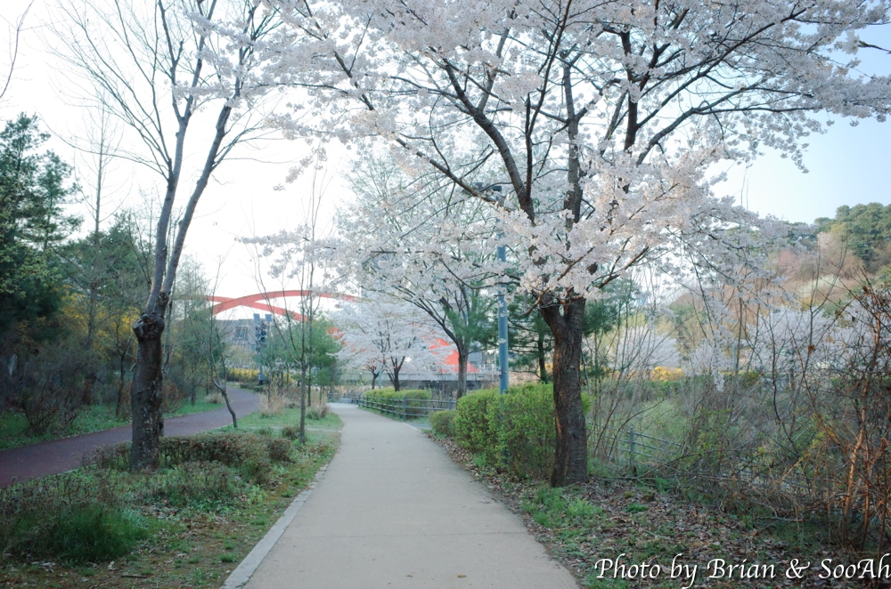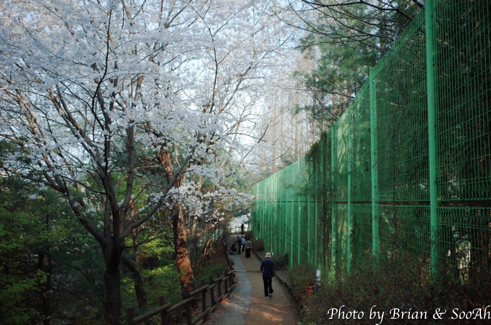 일단 집에서 버스를 타고 경기대 내에 종점에 도착해서는 걷기 시작했습니다. 경기대 캠퍼스 옆으로 난 언덕길을 올라가니, 동수원 IC에서 창룡문 사거리로 넘어올 때 보이던 높은 아치형 통로 위로 지나가게 되더군요. 수원외고와 경기남부경찰청 사이로 난 올라갔다 내려갔다 하는 고갯길을 넘다 보니, 때마침 벚꽃 시즌이라 벚꽃 구경은 잘 했네요.