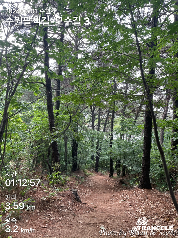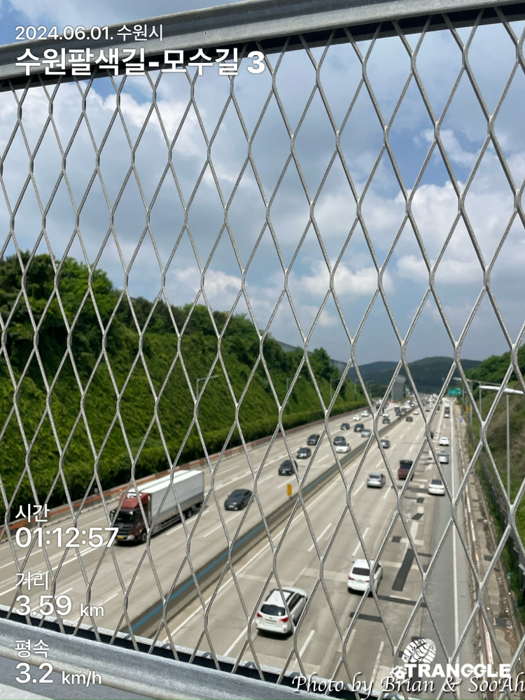 근데 여기까지 오니까 트레킹 앱이 모수길을 80% 이상 걸었다고 뱃지를 발급해주던구요... 그래서 광교산 등산로는.... 지치기도 하고 해서 여기서 그만두고 옆으로 나와서는, 모수길 트레킹을 마쳤답니다.