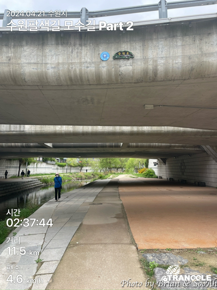 남수문을 지나서 내려가면, 효행길하고 인접하게.. 근데 효행길은 일반 차도라면, 모수길은 수원천변길이 되어서 이동하게 됩니다. 그렇게 가다 보면 수원천을 가로지르는 여러 다리 밑을 계속 지나가게 되죠.