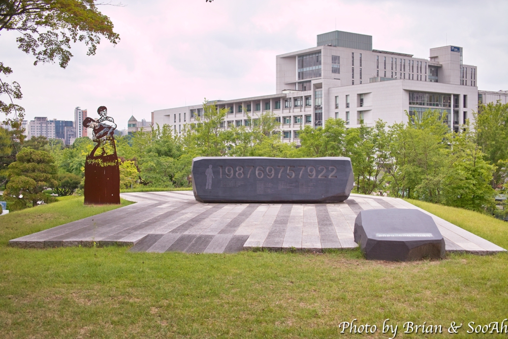 그렇게 수경원과 광혜원 터를 보다가, 자유시간이 있어서 그 주위를 보니 바로 옆에 조그만 동산에 대한민국 민주주의 역사에 잊어서는 안 되는 그런 사건과 관련된 추모 공간이 있더군요. 바로 이한열 열사를 추모하는 공간이었습니다. 추모비에 적힌 숫자는 열사께서 최루탄을 맞고 쓰러진 날(1987년 6월9일)과 사망하신 날(7월5일), 장례식 일자(7월9일), 그리고 그 당시 나이(22세)를 뜻합니다.