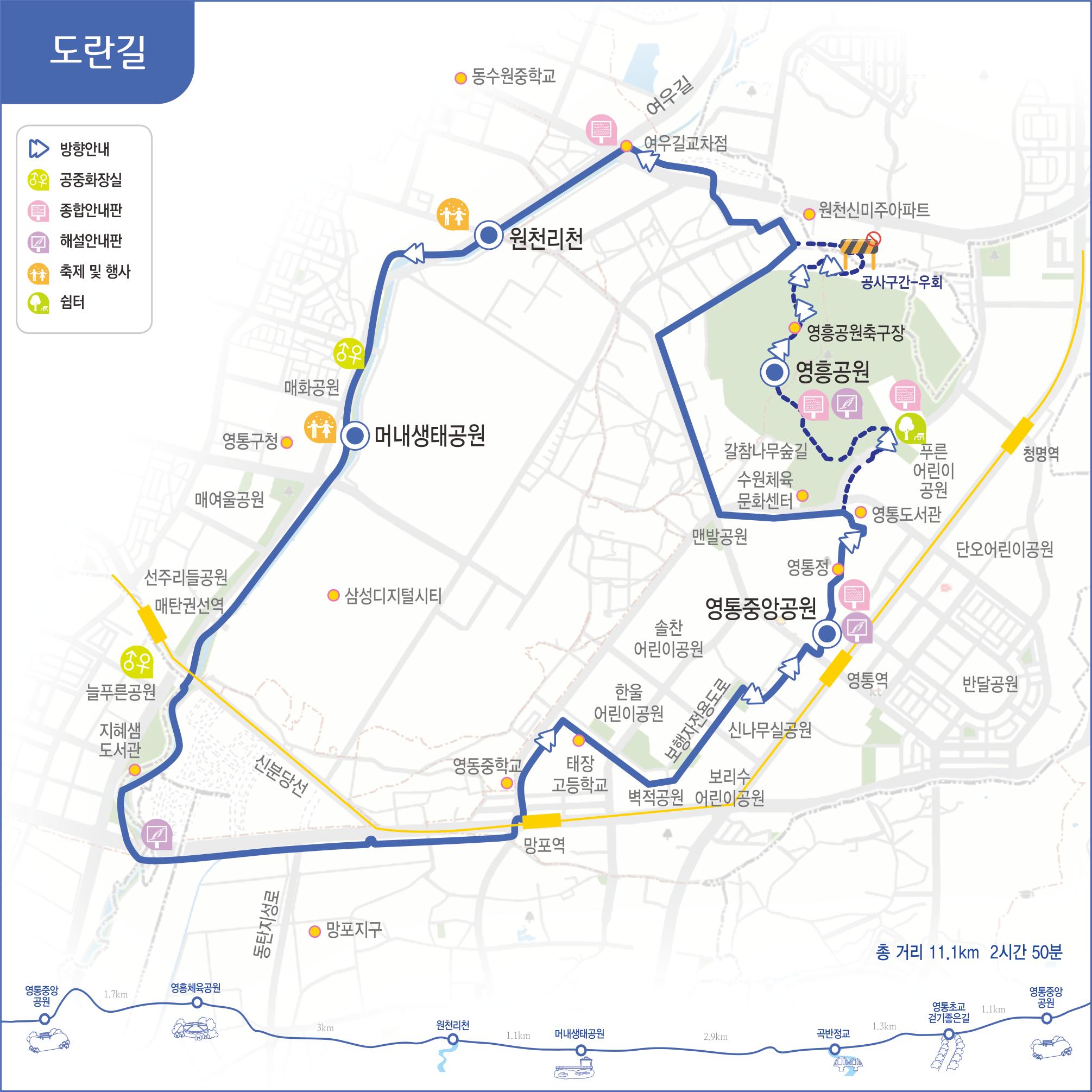 도란길은 위 지도에서 보다시피 수원의 삼성전자사업장을 도는 길이라고 해도 뭐 틀린 말은 아닌데요, 원천리천을 따라 걷다가 영통을 통과하는 한 바퀴 도는 길입니다. 원래는 영흥공원을 통과해 가는 길이라 처음 도란길을 걸었을 때는 그 길로 걸었는데, 아파트들이 생기고, 그 아파트가 도란길이 지나는 길을 막아버려서 우회하게 만들고, 또 공원이 새로 생기고 공사가 계속 되고 있어서, 수원시청 홈페이지에는 위와 같이 대신 차로를 따라 걷게 바뀌었는데, 제가 쓰는 앱에서는 예전 길을 알려줬는데, 그걸 따라가다 보면 길이 자꾸 끊기게 나와서 조금 짜증내 하며 걸었던 길이네요. 사진은 처음 도란길 걸었을 때 일부와, 최근 두번째로 차로로 바뀐 새길을 걸은 사진을 합쳐서 올립니다.