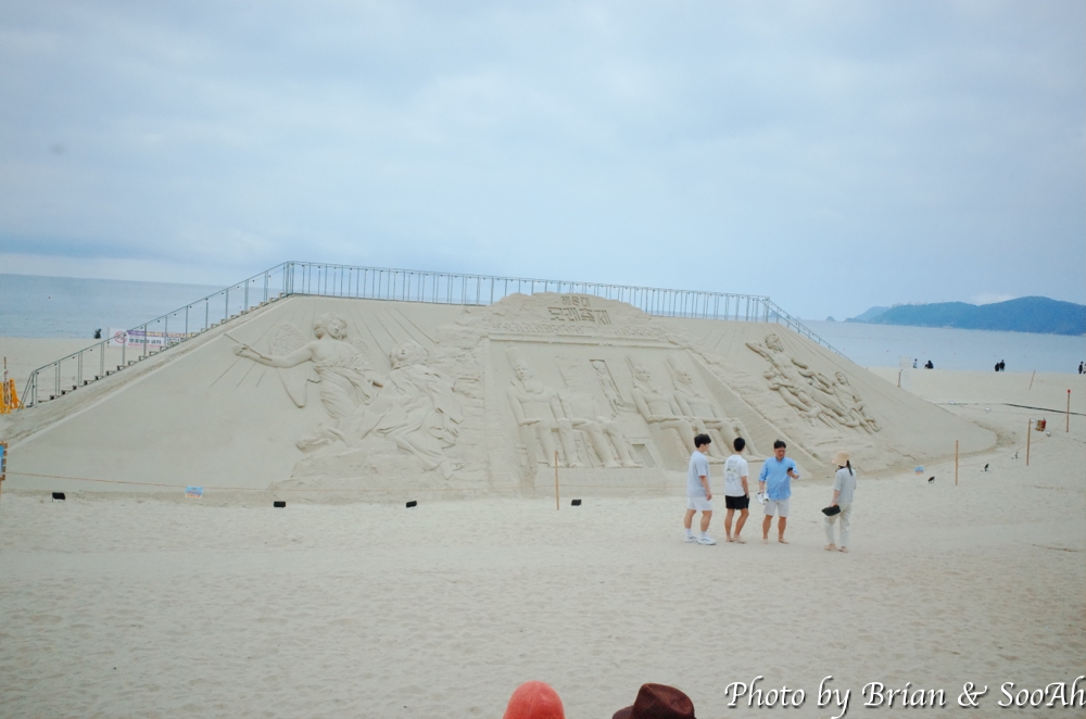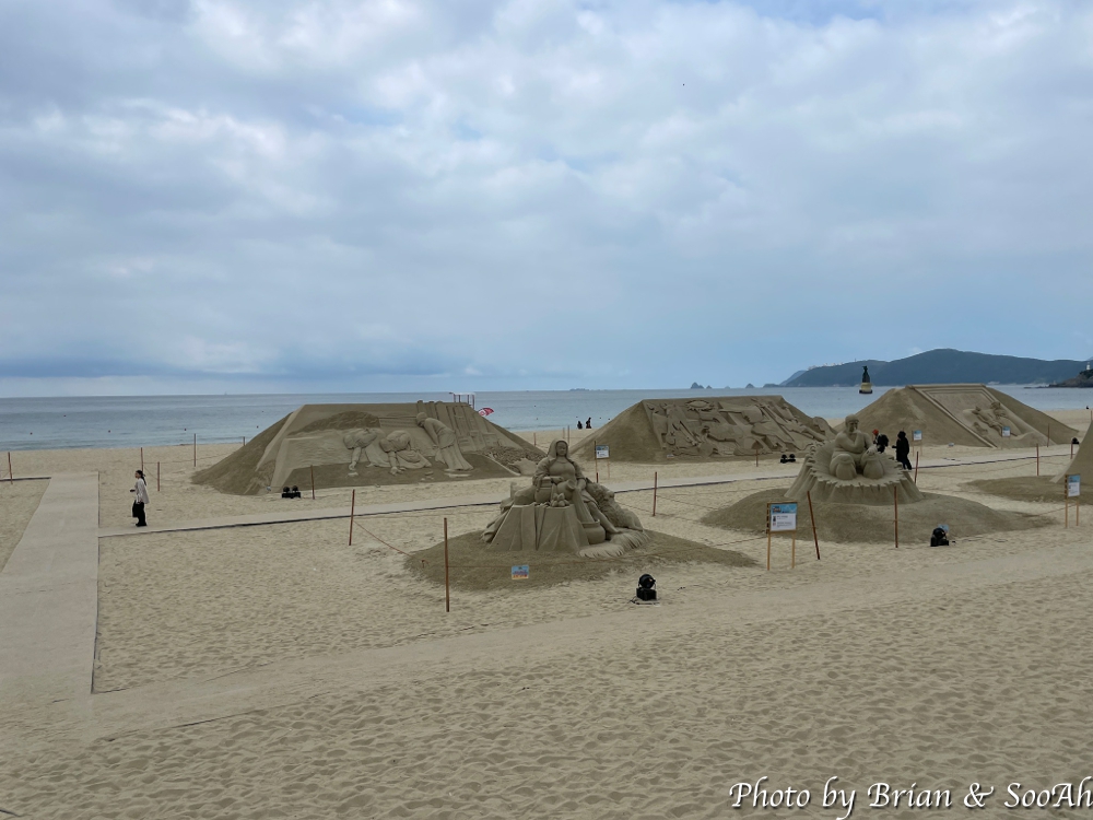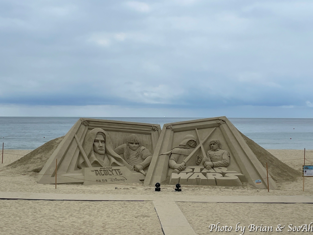 블루라인파크와 스카이캡슐의 종착역인 미포역을 지나서 나오니 해운대 해수욕장이 펼쳐지더군요. 스카이라인을 지나 걸어가니, 해운대 해수욕장의 모래사장에는 마침 모래조각들이 잔뜩 조성되어서 있더군요. 이번 6월에 개봉되는 스타워즈 시리즈 중 하나인 애콜라이트의 모래조각도 있더군요.