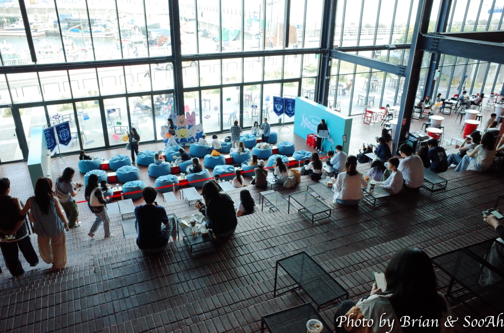 그리고 제가 입장한 아파트 쪽 말고 바닷가 쪽에는 통창으로 된 벽에 바닷가를 앉아서 바라 볼 수 있는 곳이 있더군요. 다들 이 안의 매장에서 뭔가를 사 들고 와서는 다 여기 와서 앉아 있더군요.