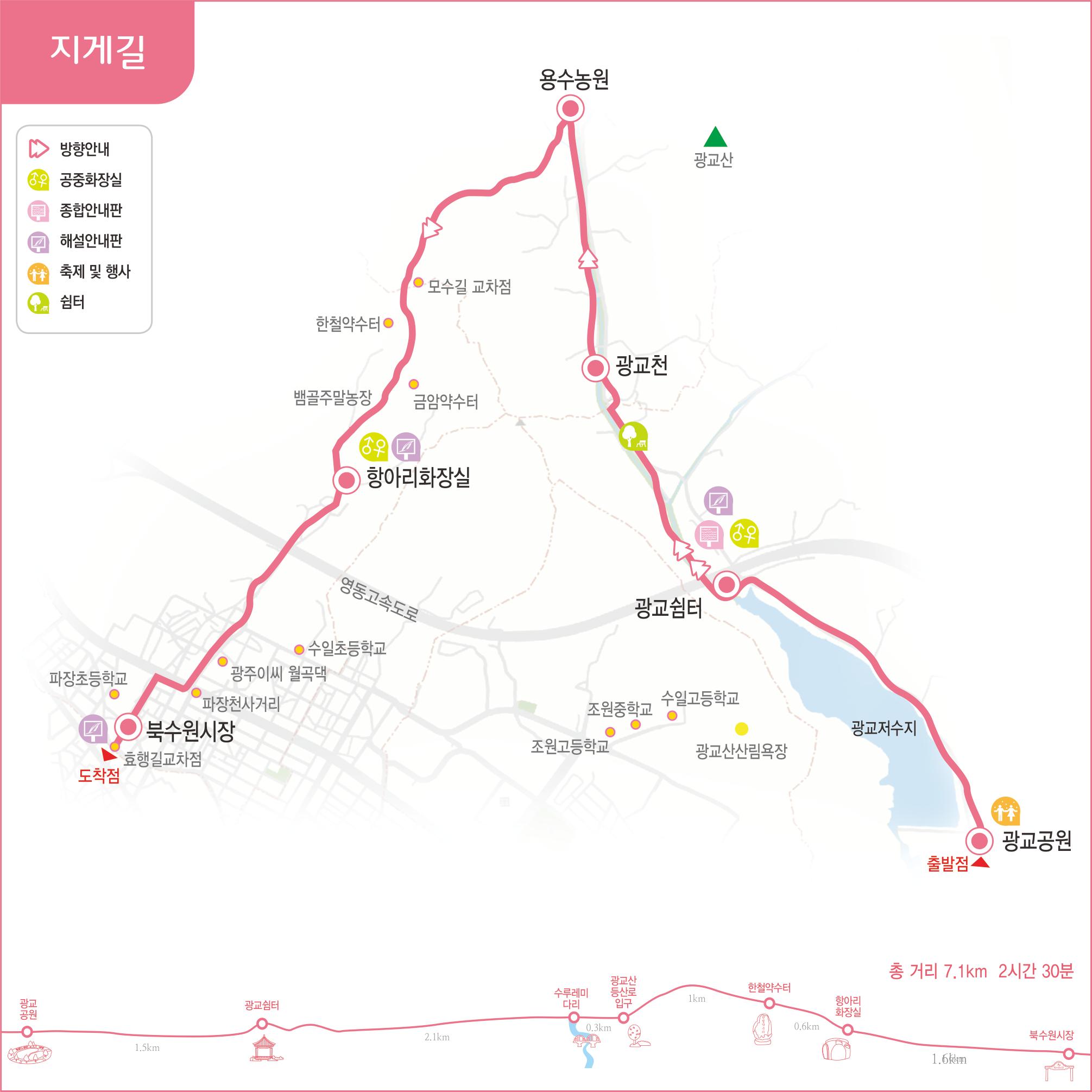 지게길은 예전에 광교산에 나무하러 가던 길이라고 하는데요, 위 지도에서 보듯이 광교호수와 광교천을 따라 걷다가 광교산을 살짝 넘어서는 파장동으로 내려가는 길입니다. 원래 광교저수지 옆길은 봄 벚꽃길로도, 그리고 그냥 산책하러도 와 본 적이 있는 길이라 좀 익숙한 편인데요. 광교천을 따라 올라갔다가 광교산을 넘는 건.... 등산이나 오르막 자체를 좋아하지 않다 보니... 그리고 이 수원팔색길을 걸으면서 처음으로 등산을 하는 거라 조금 걱정을 했습니다만... 생각보다 높진 않고, 금방 파장동 쪽 방향으로 내리막만 존재해서 좀 편하게 걸었던 기억이 나네요.