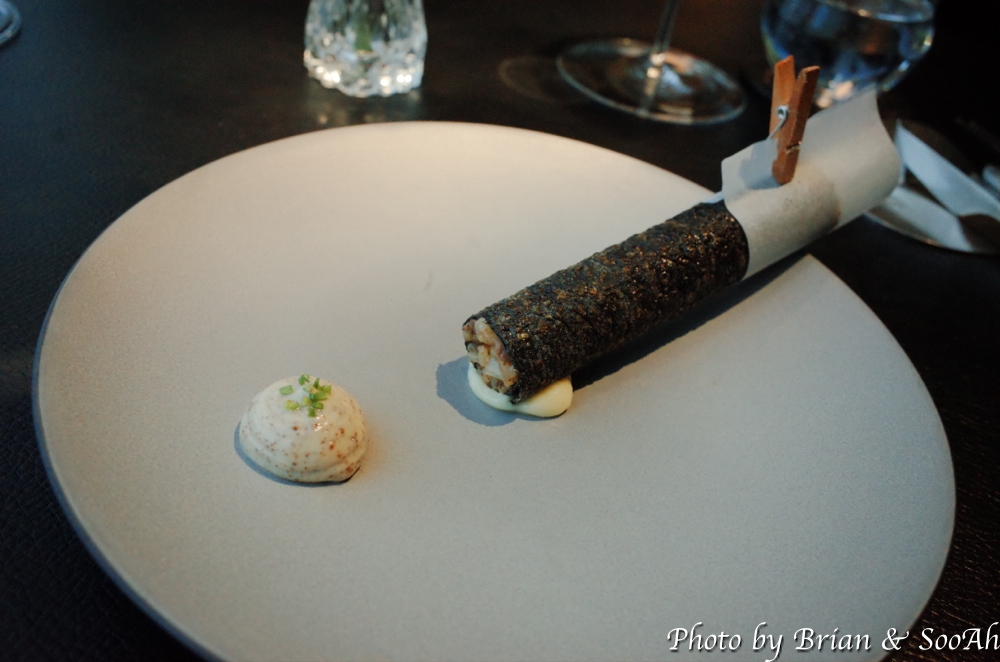 그 다음은 정식당의 시그니처라고도 알려져 있다고, 스태프 분이 자신있게 얘기한 '맛있는 김밥'이었습니다. 솔직히 김밥이 얼마나 특이할까 했는데, 아래 사진처럼 뭔가 스틱 같이 나와서 보기도 신기했는데, 개인적으로 참 좋아하는 김부각으로 래핑한 게 신기했습니다. 김부각에 찹쌀풀을 발라서 바삭하게 만든 게 신기했구요, 그리고 그 안에는 소고기와 트러플을 함께 섞은 밥이 들어가 있고, 찍어먹는 소스로는 트러플 아이올리 소스를 주더군요. 한 번 베어 먹어 봤는데, 김부각의 바삭한 느낌 때문에 식감이 너무 좋더군요. 물론 맛도 있었구요. 이게 왜 정말 그렇게 자신있게 맛있다고, 시그니처라고 하는지 알겠더군요.