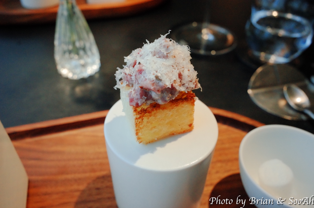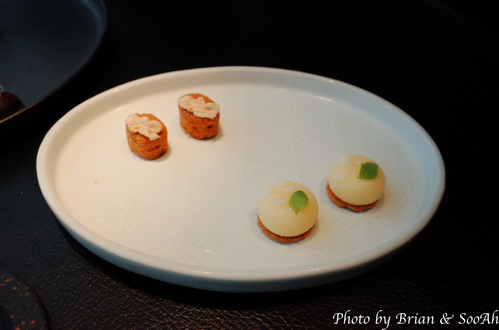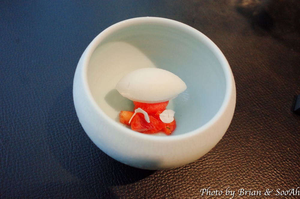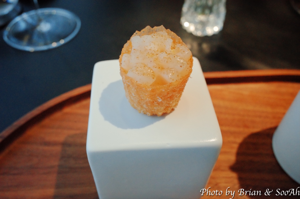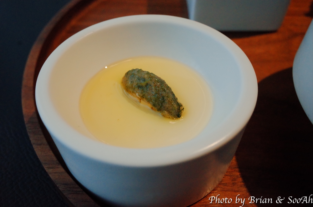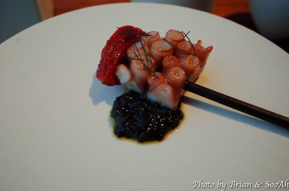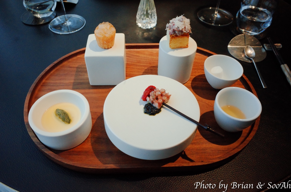 그러고는 바로 첫 Plate가 나왔습니다. 아래 개별 사진에 더 근접사진을 찍긴했는데, 가장 왼쪽부터 시계방향으로 얘기하면 첫번째는 두부와 명란 위에 감태를 바르고 들기름에 담은 플레이트였고, 그 다음은 관자타르트 위에 가쯔오부시 가루를 뿌린 요리였고, 다음은 빵 위에 트러플소스와 파마산치즈를 뿌린 전채요리였습니다. 그리고 배와 생강 레몬그라스로 만든 배 수프와, 가운데 가장 큰 플레이트에는 낙지와 드라이토마토에 먹물 소스를 함께 한 플레이트였습니다. 보기도 좋고 각각 식감이나 먹기도 좋아서 맛있게 먹었습니다.