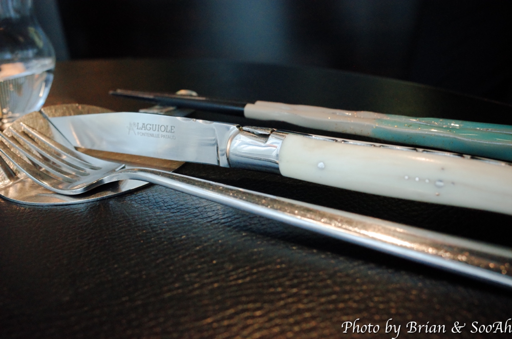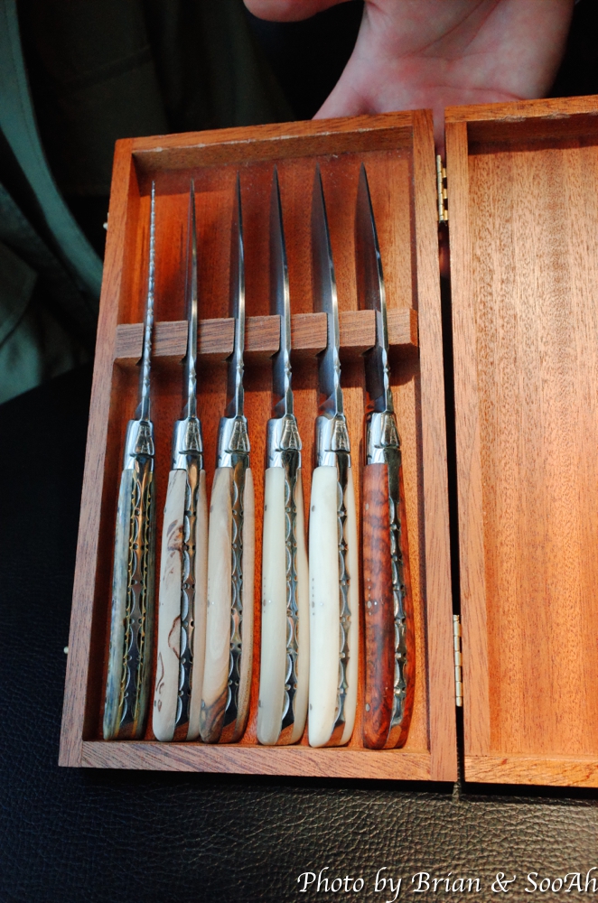 그 다음 요리는 스테이크이다 보니 스테이크르 먹을 때 사용할 나이프를 골라 보라고 하면서 프랑스 라귀올 지방에서 만든 나이프들인데 손잡이들이 여러 가지 재료로 되어 있어서 색깔이나 그립갑이 조금씩 다르더군요. 저는 상아.... 였던 거 같은데 정확히는 무슨 소재였는지는 기억이 가물가물....