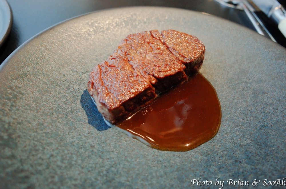 그 다음은 완도산 전복을 1시간 찐 다음에 훈연한 것을 Smoked 김치 위에 얹어서 내놓고, 그 옆에 화이트와인 베이스로 한 뵈르블랑 소스(노란색 소스)에 부추 오일을 둘러서는 내놓은 플레이트였습니다. 전복이란 식재료도 참 고급이지만, 이렇게 찌고 훈연하고, 참 손이 많이 가게 내놓으니 그만큼 풍미가 더해져서 좋더군요.